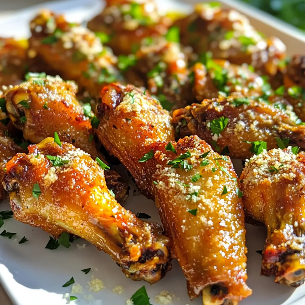 For garlic parmesan wings, I suggest trying ranch or blue cheese dressing. These creamy sauces balance the garlic flavor well. You can also serve them with a spicy hot sauce for a kick. Celery sticks on the side add a nice crunch too!