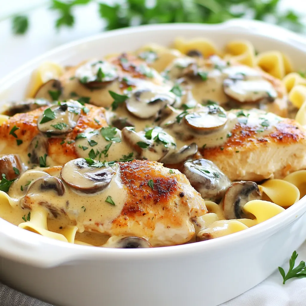 A delicious and creamy chicken stroganoff baked to perfection, served over egg noodles.