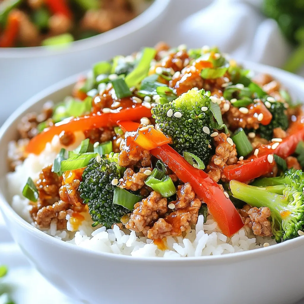 A delicious and spicy rice bowl featuring ground turkey, vegetables, and a flavorful sauce.