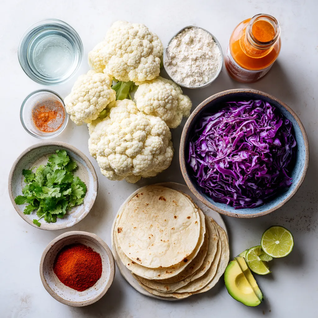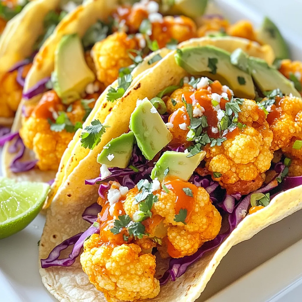 - Cauliflower: Start with one medium head of cauliflower. Cut it into small florets. This gives you the right size for baking. - Flour options: Use one cup of all-purpose flour for a classic taste. You can swap it for chickpea flour for a gluten-free choice. This keeps the batter light and crispy. - Buffalo sauce: You need one cup of buffalo sauce. You can choose store-bought or make your own. This sauce gives the tacos their spicy kick. - Avocado: Slice one avocado. This creamy fruit adds a nice balance to the spice. - Red cabbage: Shred one cup of red cabbage. It adds crunch and color to your tacos. - Cilantro: Chop half a cup of fresh cilantro. This herb brightens up the flavors in every bite. - Tortilla types: Use either corn or flour tortillas. Eight small tortillas work best for these tacos. Warm them in a skillet for soft and pliable bites. - Optional condiments: Consider adding vegan sour cream or Greek yogurt on top. These add creaminess and help cool the heat from the buffalo sauce. {{ingredient_image_1}} First, you need to preheat your oven to 450°F (230°C). This high heat will make the cauliflower crispy. Next, make the batter. In a large bowl, mix 1 cup of flour, 1 cup of water, 1 teaspoon of garlic powder, 1 teaspoon of onion powder, 1 teaspoon of smoked paprika, and 1/2 teaspoon of salt. Stir until the batter is smooth. Now it's time to coat the cauliflower. Take each floret and dip it into the batter. Make sure every piece is well-coated. Place the coated florets on a parchment-lined baking sheet. Leave some space between the pieces so they cook evenly. Bake for 20 to 25 minutes. Check them halfway through and flip each floret for even cooking. You want them golden and crispy. While the cauliflower bakes, warm your tortillas. Heat them in a dry skillet for about 30 seconds on each side. This makes them soft and easy to fold. To assemble the tacos, take a warm tortilla and add a generous scoop of buffalo cauliflower. Top it with sliced avocado, shredded red cabbage, and fresh cilantro. Don't forget to squeeze some lime juice over the top for extra flavor. You can also add vegan sour cream or Greek yogurt if you like. Enjoy your tasty tacos! To get the perfect batter, mix flour and water well. Use a whisk to blend them. The batter should be smooth and thick enough to coat the cauliflower. If it’s too runny, add a bit more flour. If it’s too thick, add a touch more water. You want it to stick but not drip off. Crispy cauliflower is key for tasty tacos. Preheat your oven to 450°F (230°C) to start. Use parchment paper on your baking sheet. This helps with easy cleanup and crispiness. Make sure to space the cauliflower florets apart on the sheet. This allows hot air to flow around them. Flip the florets halfway through baking. This way, both sides get golden and crispy. Bake for 20-25 minutes until they look delicious. You can make these tacos your own with toppings. Try adding sliced avocado for creaminess. Shredded red cabbage adds crunch and color. Don't forget fresh cilantro for a burst of flavor. For a kick, squeeze lime juice over the top. You can also add vegan sour cream or Greek yogurt if you like. These options make your tacos even more delightful! Pro Tips Use Fresh Cauliflower: For the best texture and flavor, choose a fresh, firm head of cauliflower. This ensures your tacos will have a satisfying crunch. Experiment with Spices: Feel free to adjust the spices in the batter to match your personal taste. Adding cayenne pepper or chili powder can increase the heat level! Serve Immediately: These tacos are best enjoyed fresh out of the oven. The cauliflower stays crispy when served right away, so assemble just before serving. Make It a Meal Prep: The buffalo cauliflower can be made in advance and stored in the fridge. Reheat in the oven for a quick meal prep option during the week! {{image_2}} To make these tacos gluten-free, swap all-purpose flour for chickpea flour. Chickpea flour adds a nutty taste and protein boost. Mix it with water, garlic powder, onion powder, smoked paprika, and salt to create a thick batter. This batter coats the cauliflower well and crisps up nicely in the oven. For a vegan version, use plant-based ingredients. You can replace any dairy items with vegan options. Instead of Greek yogurt, try vegan sour cream. This keeps the flavors rich and creamy, while still being entirely plant-based. Your tacos will still taste amazing without any dairy. You can adjust the spice levels to fit your taste. If you want it hot, use extra buffalo sauce or add cayenne pepper to the batter. For a milder flavor, try using less buffalo sauce. You can also explore different sauces like BBQ sauce or a tangy ranch dressing. Each option gives your tacos a unique twist. Store leftover buffalo cauliflower in an airtight container. Keep it in the fridge for up to three days. To avoid sogginess, store the tortillas separately. Wrap them in foil or plastic wrap. This keeps them fresh and prevents them from getting hard. To reheat the cauliflower, preheat your oven to 400°F (200°C). Spread the cauliflower on a baking sheet. Bake for about 10 minutes to restore crispiness. For the tortillas, heat them on a skillet for 30 seconds each side. This keeps them soft and warm. You can freeze leftover buffalo cauliflower. Place it in a freezer-safe bag. Seal it tightly and store it for up to three months. To thaw, move it to the fridge overnight. Reheat it in the oven for the best texture. You can swap buffalo sauce with other sauces. Try BBQ sauce if you want a sweeter taste. Hot sauce with butter gives a nice kick too. If you prefer a milder flavor, ranch dressing can work well. You can also create a spicy mayo by mixing mayo with hot sauce for a creamy touch. Yes, you can prep the cauliflower ahead. Cut the florets and store them in the fridge. Keep them in an airtight container for up to 2 days. You can also make the batter in advance. Just store it in the fridge until y
