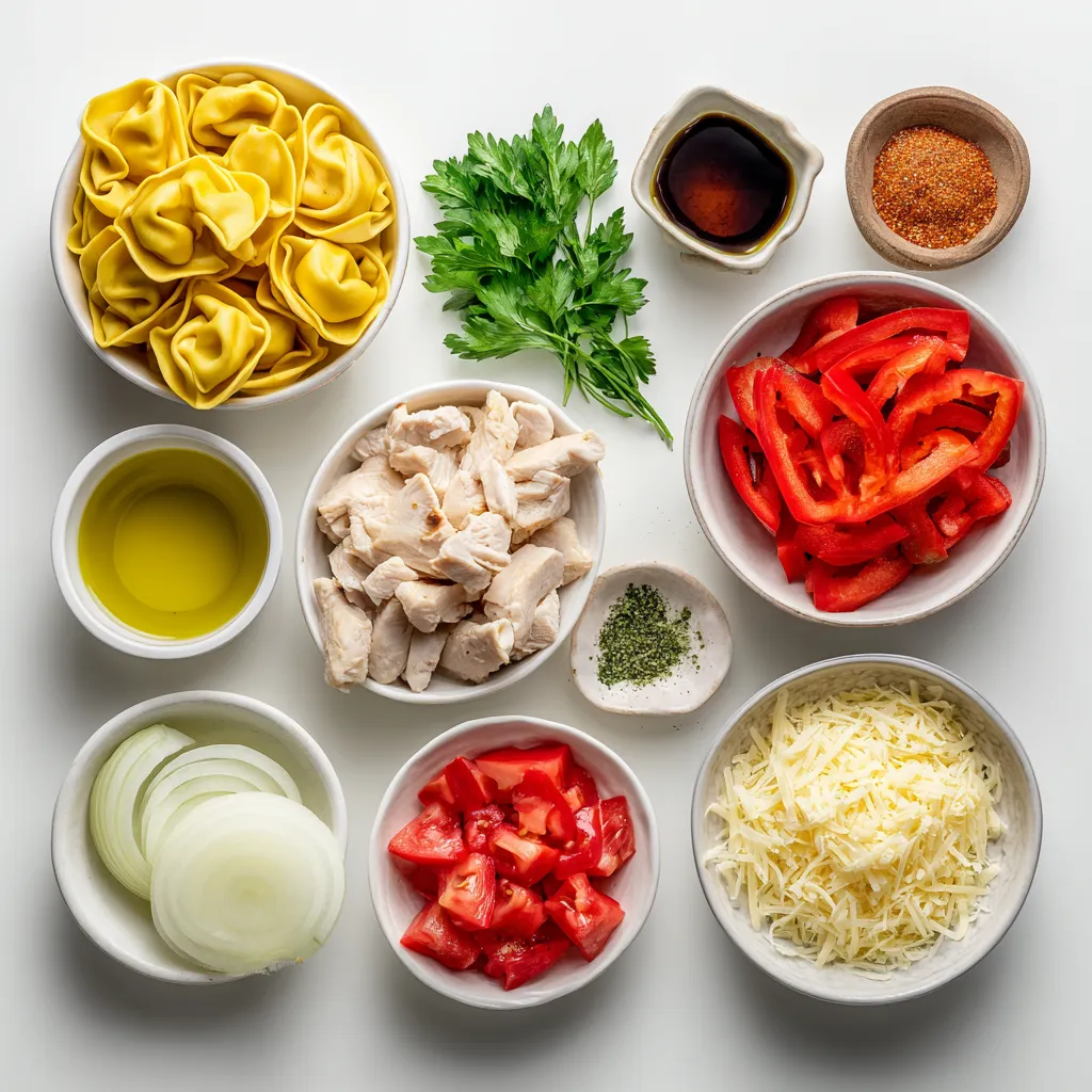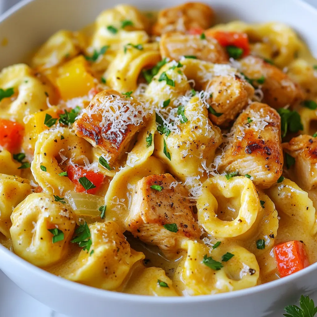 A flavorful dish combining cheese tortellini, seasoned chicken, and a creamy sauce with vegetables.