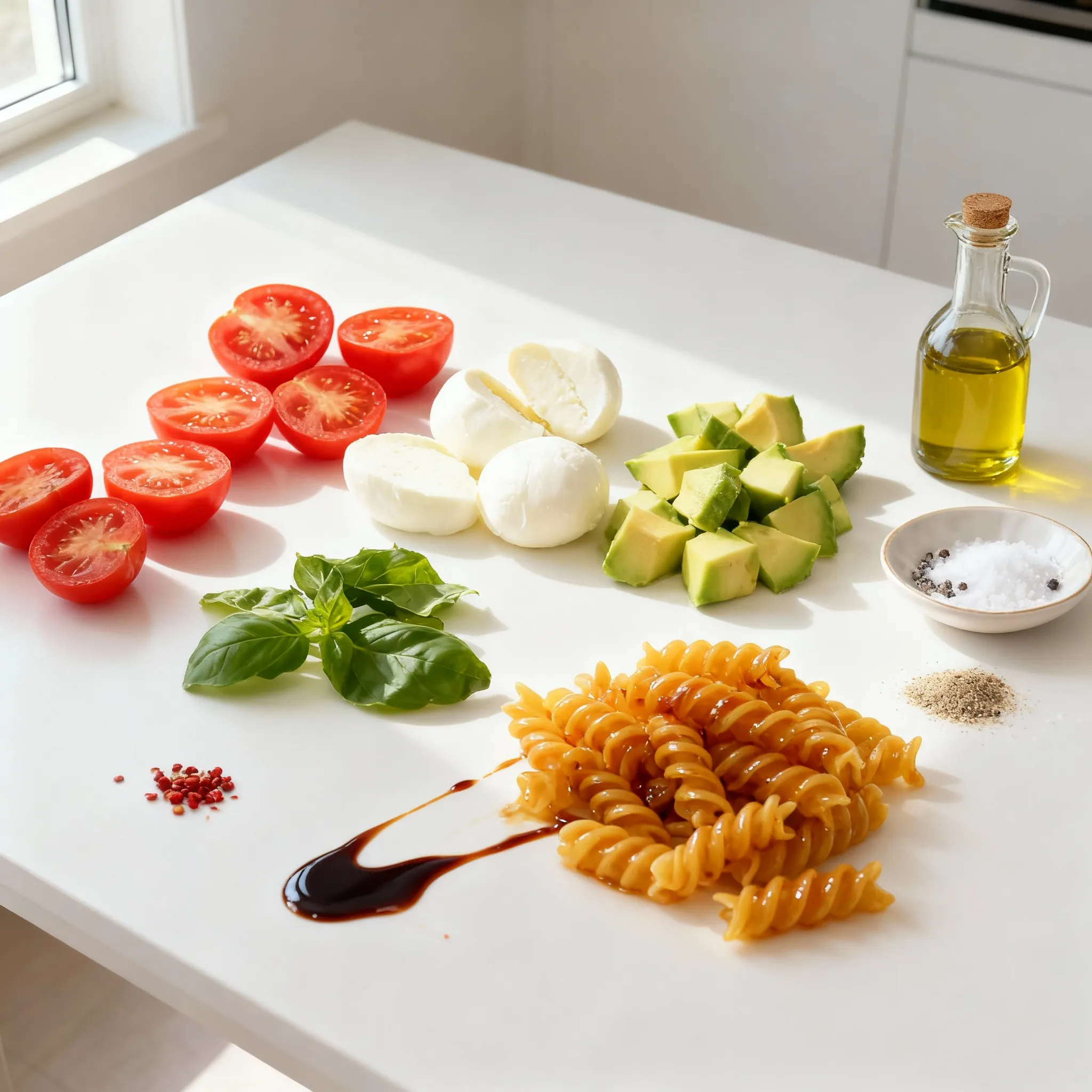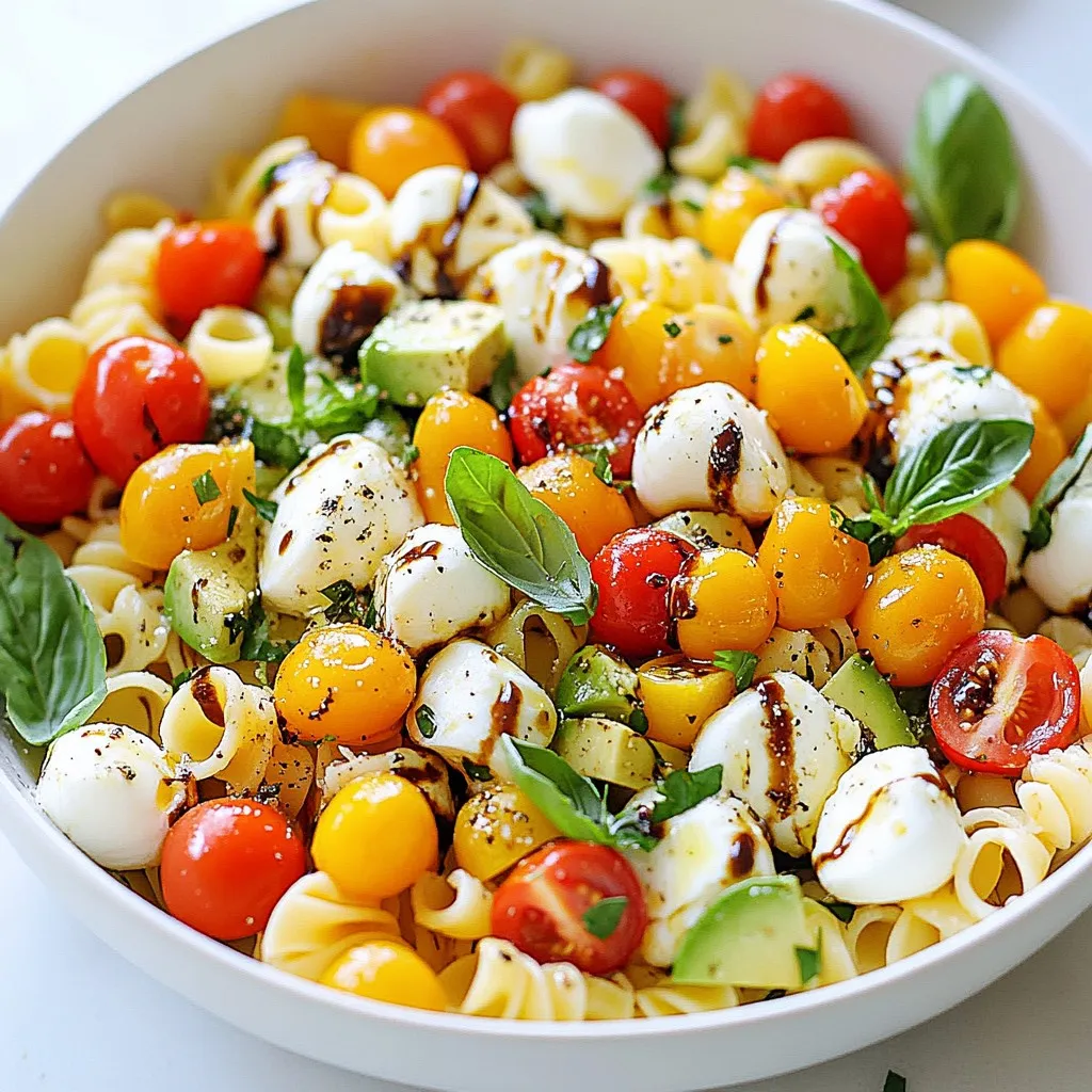 A refreshing pasta salad featuring cherry tomatoes, mozzarella, avocado, and fresh basil, dressed with a balsamic glaze.