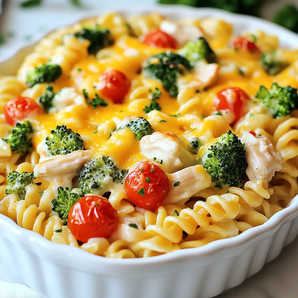 For a tasty Cheesy Chicken Pasta Bake, gather these main ingredients: - 2 cups rotini pasta - 2 cups cooked chicken, shredded - 1 cup broccoli florets (fresh or frozen) - 1 cup cherry tomatoes, halved - 2 cups shredded cheddar cheese - 1 cup Alfredo sauce (store-bought or homemade) - 1/2 cup cream cheese, softened - 1 teaspoon garlic powder - 1 teaspoon onion powder - 1/2 teaspoon paprika - Salt and pepper to taste - 1/4 cup fresh parsley, chopped (for garnish) These ingredients come together to create a warm, cheesy dish that the whole family loves. Each one plays a key role in building flavor and texture. The rotini pasta acts as a sturdy base. The shredded chicken adds protein, while broccoli and cherry tomatoes bring color and nutrition. The blend of cheeses and sauces creates that creamy, cheesy goodness we all crave. To make this dish, you'll need some essential tools: - Baking dish - Mixing bowls - Pot for boiling pasta - Wooden spoon or spatula Using the right tools makes cooking easier and more fun. A good baking dish helps your pasta bake cook evenly. Mixing bowls are perfect for combining ingredients without making a mess. A pot for boiling pasta ensures you get that perfect al dente texture. Lastly, a wooden spoon or spatula helps you mix everything well. With these tools, you'll be ready to create a delicious meal. {{ingredient_image_1}} First, cook the rotini pasta. Follow the package instructions. Cook until al dente. This means the pasta should be firm but not hard. Drain the pasta well and set it aside. Next, shred the cooked chicken. You can use leftover chicken or store-bought rotisserie chicken. Shredding makes it easy to mix with the pasta and sauce. In a large bowl, mix the shredded chicken, broccoli florets, and halved cherry tomatoes with the cooked pasta. Make sure everything is well combined. Now, create the cheese sauce mixture. In a separate bowl, mix the Alfredo sauce with softened cream cheese. Add garlic powder, onion powder, paprika, salt, and pepper. Stir until the mixture is smooth and creamy. Pour the cheese sauce over the chicken and pasta. Mix it well so everything is coated. Then, stir in 1 ½ cups of shredded cheddar cheese. This adds a rich flavor. Transfer the mixture to a greased 9x13 inch baking dish. Spread it evenly across the dish. Top with the remaining ½ cup of cheddar cheese. This will create a nice cheesy crust. Bake in a preheated oven at 375°F (190°C). Bake for 25-30 minutes. The cheese should be melted and bubbly. After baking, let it cool for a few minutes. Then, enjoy your cheesy chicken pasta bake! To ensure your pasta cooks just right, always boil it until it's al dente. This means the pasta should be firm but not hard. Follow the package instructions for timing. Once cooked, drain it well to prevent extra moisture in your bake. When it comes to cheese, clumping can ruin your dish. To avoid this, sprinkle cheese evenly throughout the pasta mixture. Stir gently to coat everything well. This way, you get that creamy, cheesy goodness in every bite. Garnishing with fresh parsley adds a lovely touch to your Cheesy Chicken Pasta Bake. Just chop it finely and sprinkle it on top before serving. This bright color makes the dish pop and adds a fresh flavor. For serving, pair your pasta bake with a simple salad or garlic bread. This makes a complete meal that your family will love. Feel free to switch things up with different veggies or proteins. You can use spinach, bell peppers, or even mushrooms. If you want a new protein, try using turkey or a meat substitute for a vegetarian option. Adjusting spice levels is easy too. If you like heat, add red pepper flakes. For cheese, try using mozzarella for a milder taste or gouda for a smoky flavor. Pro Tips Cook Pasta Al Dente: Make sure to cook the rotini pasta until it's al dente to avoid mushiness after baking. Mix Ingredients Thoroughly: Ensure all ingredients are well mixed in the sauce to achieve a uniform flavor in every bite. Use Fresh Ingredients: Opt for fresh broccoli and cherry tomatoes when possible to enhance the dish's flavor and nutrition. Let It Rest: Allow the dish to cool for a few minutes before serving to help it set and to avoid burns. {{image_2}} You can change the pasta type in this dish. Try using penne or fusilli for fun shapes. You can even use whole wheat or gluten-free pasta for healthier choices. For protein, shredded turkey works well, too. If you want a vegetarian version, use chickpeas or extra veggies. This keeps the bake hearty and filling. Different sauces can change the whole taste. Swap the Alfredo sauce for marinara to give it a tangy kick. Pesto adds fresh herbs and a burst of flavor. You can also add herbs like basil or thyme. A sprinkle of red pepper flakes brings heat. Feel free to play with spices to find your favorite mix. If you need a gluten-free option, use gluten-free pasta. There are many good brands available now. Check the labels to ensure they meet your needs. For a dairy-free version, try using almond cream or cashew cheese. These substitutes can give you a similar creamy texture. Don't forget to check for dairy-free cheese options for topping. To store leftovers, let the dish cool completely. Once cooled, transfer it to an airtight container. You can use glass or plastic containers with tight lids. These keep the dish fresh and prevent odors. Always label the container with the date. This helps you track freshness. For freezing, first, let the dish cool. Then, portion it into freezer-safe containers. Make sure to leave some space at the top for expansion. Wrap each container tightly with plastic wrap for extra protection. When you’re ready to eat, thaw the dish in the fridge overnight. Reheat in the oven at 350°F until hot, about 20-30 minutes. You can also microwave individual portions for quick meals. In the fridge, Cheesy Chicken Pasta Bake lasts about three to four days. If frozen, it can stay good for up to three months. After this t