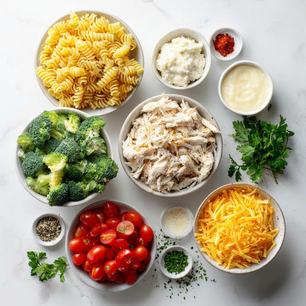 These ingredients come together to create a warm, cheesy dish that the whole family loves. Each one plays a key role in building flavor and texture. The rotini pasta acts as a sturdy base. The shredded chicken adds protein, while broccoli and cherry tomatoes bring color and nutrition. The blend of cheeses and sauces creates that creamy, cheesy goodness we all crave.