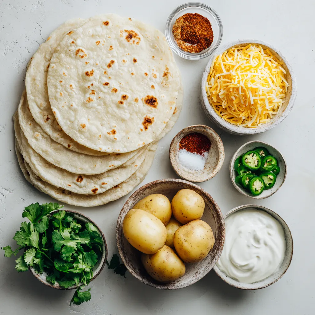 • On each tortilla, place a generous spoonful of the cheesy potato mixture in the center. Top with a dollop of sour cream, some fresh cilantro, and jalapeño slices if using.
