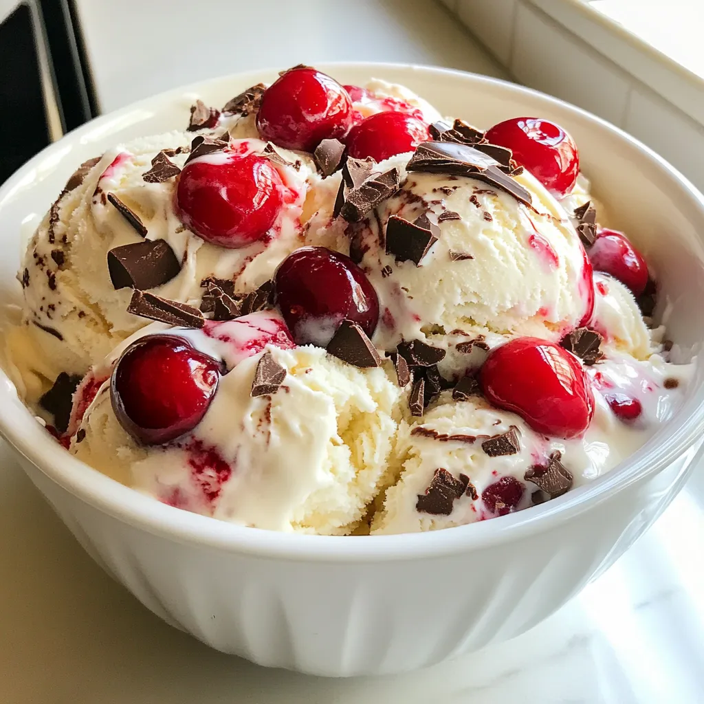 A delightful homemade version of the classic Cherry Garcia ice cream, featuring rich cream, sweet cherries, and chocolate chips.