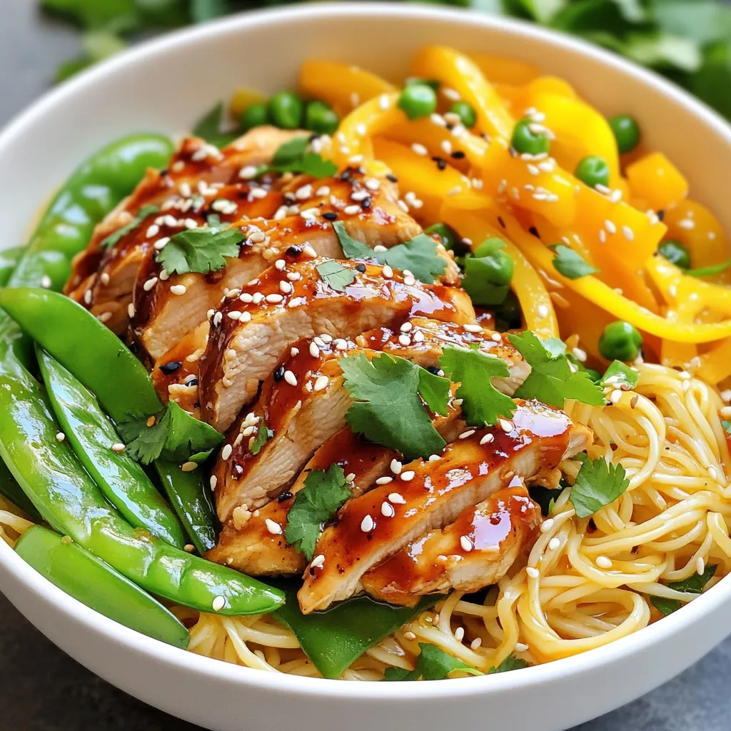 To make Chicken Teriyaki Noodles, gather these key ingredients: - 2 chicken breasts, thinly sliced - 200g egg noodles - 1 bell pepper, julienned (red or yellow) - 1 cup snap peas - 3 green onions, chopped - 2 cloves garlic, minced - 1 tablespoon ginger, freshly grated - 5 tablespoons soy sauce - 2 tablespoons honey - 1 tablespoon sesame oil - 1 tablespoon cornstarch mixed with 2 tablespoons water - 2 tablespoons vegetable oil for cooking These ingredients create a balanced dish with protein, carbs, and fresh veggies. For a nice finish, consider these garnishing items: - Sesame seeds - Fresh cilantro, chopped These add color and a fresh flavor to your meal. You can enhance your dish with these optional ingredients: - Red pepper flakes for heat - A squeeze of lime juice for brightness - Sliced carrots for added crunch These can bring new layers of taste to your noodles. {{ingredient_image_1}} To start, cook the egg noodles. Boil water in a pot. Add the noodles and cook as per the package instructions. This usually takes around 5-7 minutes. Once done, drain the noodles and set them aside. Make sure they don’t stick together. Grab a small bowl and mix the sauce. Combine 5 tablespoons of soy sauce, 2 tablespoons of honey, and 1 tablespoon of sesame oil. Add 2 cloves of minced garlic and 1 tablespoon of freshly grated ginger. Stir well until everything blends nicely. This sauce will give your dish that sweet and salty flavor. Now, heat 2 tablespoons of vegetable oil in a large skillet or wok over medium-high heat. Add the sliced chicken breasts. Cook them for about 5-7 minutes until they are golden brown and cooked through. Then, toss in 1 bell pepper and 1 cup of snap peas. Stir-fry for 3-4 minutes. The veggies should be tender but still crisp. Once the chicken and veggies are ready, pour the teriyaki sauce over them. Mix it well to coat everything. Next, add 1 tablespoon of cornstarch mixed with 2 tablespoons of water. This will thicken the sauce. Cook for another 2-3 minutes until the sauce looks glossy. Finally, toss in the cooked egg noodles. Mix until the noodles are coated in the tasty sauce. Serve in bowls and add chopped green onions, sesame seeds, and fresh cilantro on top for a nice touch. Enjoy your Chicken Teriyaki Noodles! To cook chicken perfectly, start with fresh chicken breasts. Thinly slice them for quick cooking. Use medium-high heat in your skillet or wok. This helps to sear the chicken, keeping it juicy. Make sure to stir often, so it cooks evenly. Cook until the chicken is golden brown, which takes about 5-7 minutes. Always check that the chicken is cooked through. You can cut a piece to make sure it's not pink inside. This step is key for a safe and tasty meal. To make the best teriyaki sauce, measure your ingredients carefully. Mix soy sauce, honey, sesame oil, minced garlic, and grated ginger in a bowl. Whisk them together until they blend well. This mix brings a sweet and savory flavor. Adding cornstarch mixed with water helps thicken the sauce. Pour it in at the end of cooking. Cook for a few minutes until it becomes glossy. This makes the sauce cling to your chicken and vegetables, enhancing each bite. When serving Chicken Teriyaki Noodles, presentation matters. Use deep bowls for a nice look. After plating, sprinkle chopped green onions on top. Add sesame seeds and fresh cilantro for color and flavor. These garnishes not only taste great but also make your dish shine. For extra crunch, you can serve with toasted sesame seeds. Offer lime wedges on the side for a fresh twist. This will give your meal a bright, zesty finish. Pro Tips Marinate the Chicken: For extra flavor, let the sliced chicken marinate in the teriyaki sauce for at least 30 minutes before cooking. Veggie Variations: Feel free to swap in your favorite vegetables such as broccoli, carrots, or bok choy for a different twist. Adjusting Sweetness: If you prefer a sweeter teriyaki sauce, simply increase the amount of honey to suit your taste. Garnishing Tips: For added texture and flavor, sprinkle toasted sesame seeds and chopped nuts like peanuts or cashews on top before serving. {{image_2}} You can easily swap chicken for tofu. Use firm tofu for the best texture. Start by pressing the tofu to remove water. Cut it into cubes and pan-fry until golden. Follow the same cooking steps as with chicken. Tofu absorbs the teriyaki sauce well and gives a great taste. If you need a gluten-free option, use tamari instead of soy sauce. It has a similar flavor without the gluten. You can also switch egg noodles for rice noodles or zucchini noodles. Both options work well and taste great with teriyaki sauce. Feel free to mix in other veggies. Broccoli, carrots, or bok choy add color and crunch. You can also try mushrooms for a savory flavor. Just be sure to cut the veggies into small pieces. This helps them cook evenly and blend well with the noodles. Store any leftover Chicken Teriyaki Noodles in an airtight container. Make sure the noodles cool down first. You can keep them in the fridge for up to three days. This way, the flavors stay fresh and tasty. To reheat, use the microwave or a pan. If using a microwave, place the noodles in a bowl. Add a splash of water to keep them moist. Heat in short bursts, stirring often, until hot. If using a pan, add a tiny bit of oil and heat over medium. Stir until warmed through. You can freeze Chicken Teriyaki Noodles for later. Store them in a freezer-safe bag or container. Remove as much air as possible to avoid freezer burn. They can last up to three months in the freezer. When you're ready to eat, thaw them in the fridge overnight. Reheat as directed above for a quick meal. Yes, you can use many types of noodles. Rice noodles work well for a gluten-free option. Udon noodles are also a great choice for a chewy texture. If you prefer whole wheat, you can find whole wheat egg noodles. Feel free to experiment and find your favorite! To add heat, try adding red pepper flakes or s