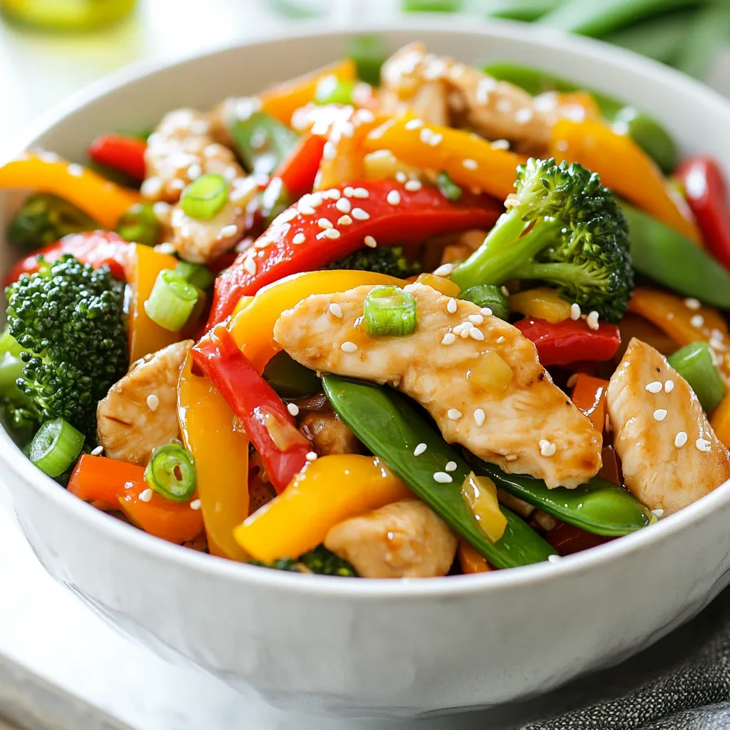 A vibrant and healthy stir fry featuring chicken and a variety of colorful vegetables.