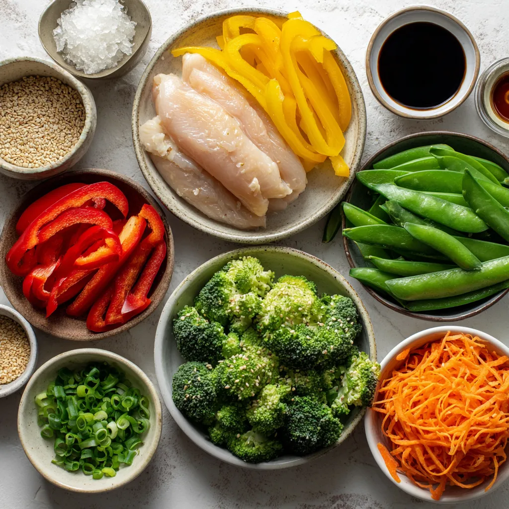 The main ingredients in this stir fry create a colorful and healthy dish. The chicken breast gives you lean protein. The bell peppers add sweetness and crunch. Broccoli florets bring fiber and vitamins. Snap peas add a nice snap, while carrots add a hint of earthiness.