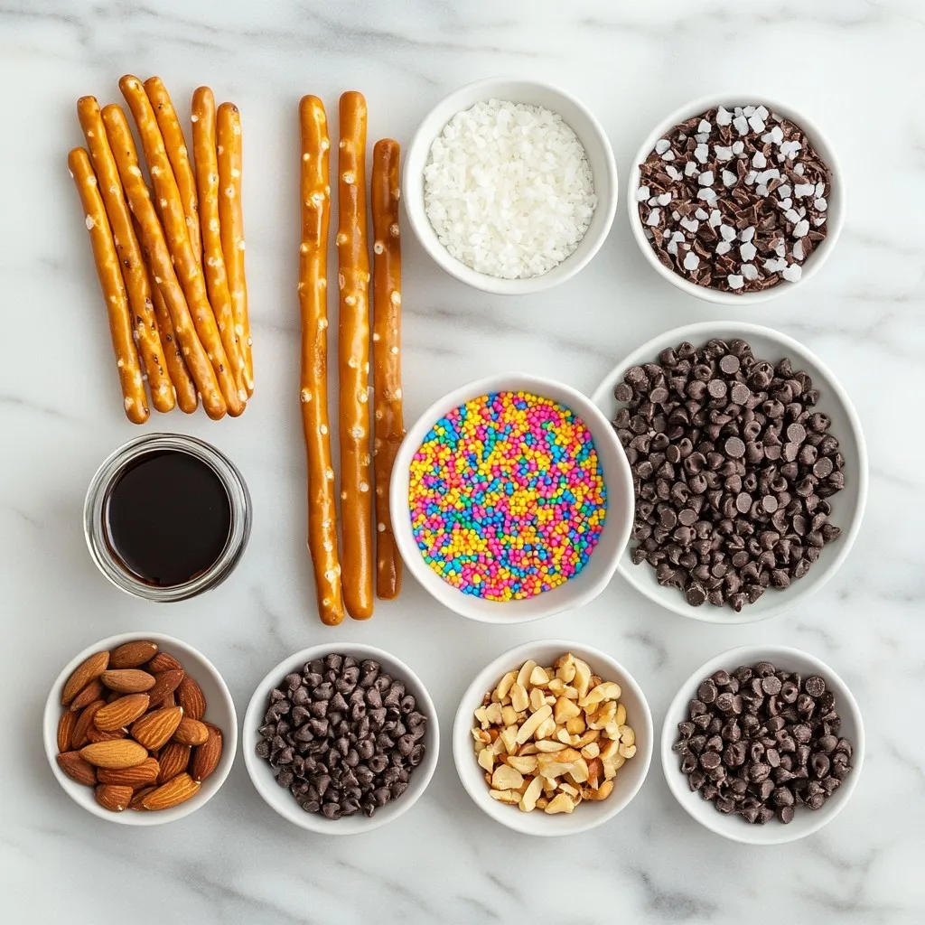 To make chocolate-covered pretzel rods, you need a few simple ingredients. First, grab 10 pretzel rods. These crunchy treats give a nice salty contrast to the sweet chocolate. Next, you will need 1 cup of dark chocolate chips. Dark chocolate melts well and adds rich flavor. Add 1 tablespoon of coconut oil to help the chocolate stay smooth. Lastly, gather 1/2 cup of assorted toppings. You can use sprinkles, crushed nuts, sea salt, or mini chocolate chips for a fun finish.