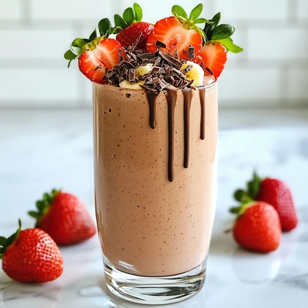 In this delightful Chocolate Covered Strawberry Smoothie, each ingredient plays a key role. Let’s break down the list of what you need: - 1 cup fresh strawberries, hulled - 1 banana, frozen - 1 cup almond milk (or milk of choice) - 2 tablespoons cocoa powder - 1 tablespoon honey or maple syrup - 1/4 cup Greek yogurt - Ice cubes (optional) - Chocolate shavings or pieces for garnish Fresh strawberries are the star of this show. They add a bright, fruity flavor. The frozen banana brings in natural sweetness and creamy texture. Almond milk keeps it light and tasty, but you can use any milk you prefer. Cocoa powder gives us that rich chocolate flavor we crave. Honey or maple syrup sweetens the mix just right. Greek yogurt adds creaminess and a boost of protein. If you like a thicker smoothie, throw in some ice cubes. Finally, finish it off with chocolate shavings. They add a nice touch and make it look fancy. These ingredients blend together to create a smooth and creamy drink. Each sip is a tasty reminder of chocolate-covered strawberries. You’ll love how easy it is to make this treat! {{ingredient_image_1}} Start by hulling the strawberries. This means you cut off the green tops and remove the white part. Use a small knife or a huller. This step makes the strawberries sweet and ready for blending. Next, freeze the banana. Peel the banana and slice it into small pieces. Spread the banana pieces on a plate and place it in the freezer. This will give your smoothie a nice, creamy texture. Now, it is time to blend! Take your hulled strawberries, frozen banana, and your choice of almond milk. Add them into the blender. Next, add the cocoa powder, honey, and Greek yogurt. These ingredients make your smoothie rich and flavorful. If you want a thicker smoothie, toss in a handful of ice cubes. This will make your drink cold and refreshing. Blend everything on high until it is smooth and creamy. Make sure to scrape down the sides if needed. After blending, taste your smoothie. If it is not sweet enough, add more honey or maple syrup. Blend again for a quick mix. Now, pour the smoothie into a tall glass. For a fun finish, add chocolate shavings on top. You can also place a fresh strawberry on the rim of the glass. Enjoy your delicious treat! To boost the taste, try different milks. Almond milk gives a nice nutty flavor. Regular milk or oat milk can also work well. Each milk adds its own twist. Using frozen strawberries is a great idea too. They make the smoothie thicker and creamier. Frozen fruit keeps the drink cold without adding ice. This way, the flavor shines through. You can adjust the sweetness to fit your taste. Start with one tablespoon of honey or maple syrup. Blend, then taste. If you want it sweeter, add more. For a sugar-free option, use ripe bananas. They add natural sweetness without sugar. You can also try stevia or monk fruit sweetener as alternatives. Pro Tips Choose Ripe Strawberries: Select strawberries that are bright red and slightly soft to the touch for the best flavor and sweetness. Frozen Banana for Creaminess: A frozen banana not only adds natural sweetness but also gives the smoothie a creamy texture. Adjust Sweetness to Taste: Depending on the ripeness of your bananas and strawberries, you may need to adjust the amount of honey or maple syrup. Garnish with Flair: Enhance presentation by adding chocolate shavings or a drizzle of melted chocolate on top before serving. {{image_2}} You can add almond or peanut butter for a rich twist. Just one or two tablespoons will do. The nutty flavor pairs well with the chocolate and strawberry. It also adds healthy fats and protein. This change makes the smoothie even creamier. Blend it all together until smooth, and enjoy your nutty delight! If you want a vegan smoothie, simply swap the Greek yogurt. Use coconut yogurt or any plant-based yogurt. This keeps the smooth and creamy texture without dairy. The taste remains delicious, and you still get that chocolate-strawberry flavor. It's a great choice for those who avoid animal products! To make your smoothie even more filling, add protein powder. A scoop of your favorite protein blend works great. You can also add more Greek yogurt if you prefer. This extra protein helps keep you full longer. It's perfect for a post-workout snack or a busy morning meal. Blend it in, and enjoy a more satisfying smoothie! To keep your Chocolate Covered Strawberry Smoothie fresh, consider these tips: - Refrigerating leftovers: Store any leftover smoothie in an airtight container. It stays good for up to 24 hours in the fridge. When you are ready to drink it, shake or stir well to mix the ingredients again. - Freezing portions for later use: If you want to save some for later, freeze the smoothie in ice cube trays. Once frozen, pop the cubes into a bag. You can blend them later for a quick and easy treat. How do you reinvigorate a smoothie after refrigeration? Simply add a splash of almond milk or water to the smoothie. Blend it again until it’s smooth. This adds moisture and brings back its delicious texture. If it’s too thick, just add a bit more liquid until you are happy with the consistency. Yes, you can use frozen strawberries. They bring a lot of benefits. Frozen strawberries are picked at peak ripeness. This means they taste great! They also make your smoothie cold and creamy. Plus, using frozen fruit can make your smoothie thicker. This can be fun if you like a shake-like texture. To make your smoothie more filling, try adding a few things. You can mix in oats for fiber. They will help keep you full longer. You can also add nut butter. Almond or peanut butter adds healthy fats and protein. Another option is to use more Greek yogurt. This adds creaminess and extra protein. Absolutely! This smoothie is great for kids. It has natural sweetness from strawberries and banana. Kids love the taste of chocolate, too! The Greek yogurt gives them protein and calcium. This makes it a healthy treat. It’