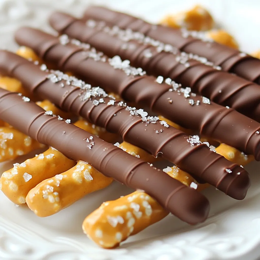 Delicious pretzel rods coated in creamy peanut butter and rich chocolate, topped with a sprinkle of sea salt.