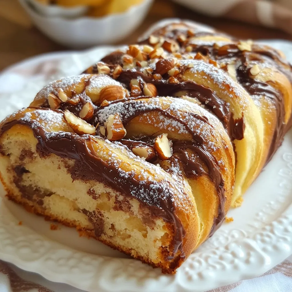A rich and indulgent babka filled with chocolate hazelnut spread and toasted hazelnuts.