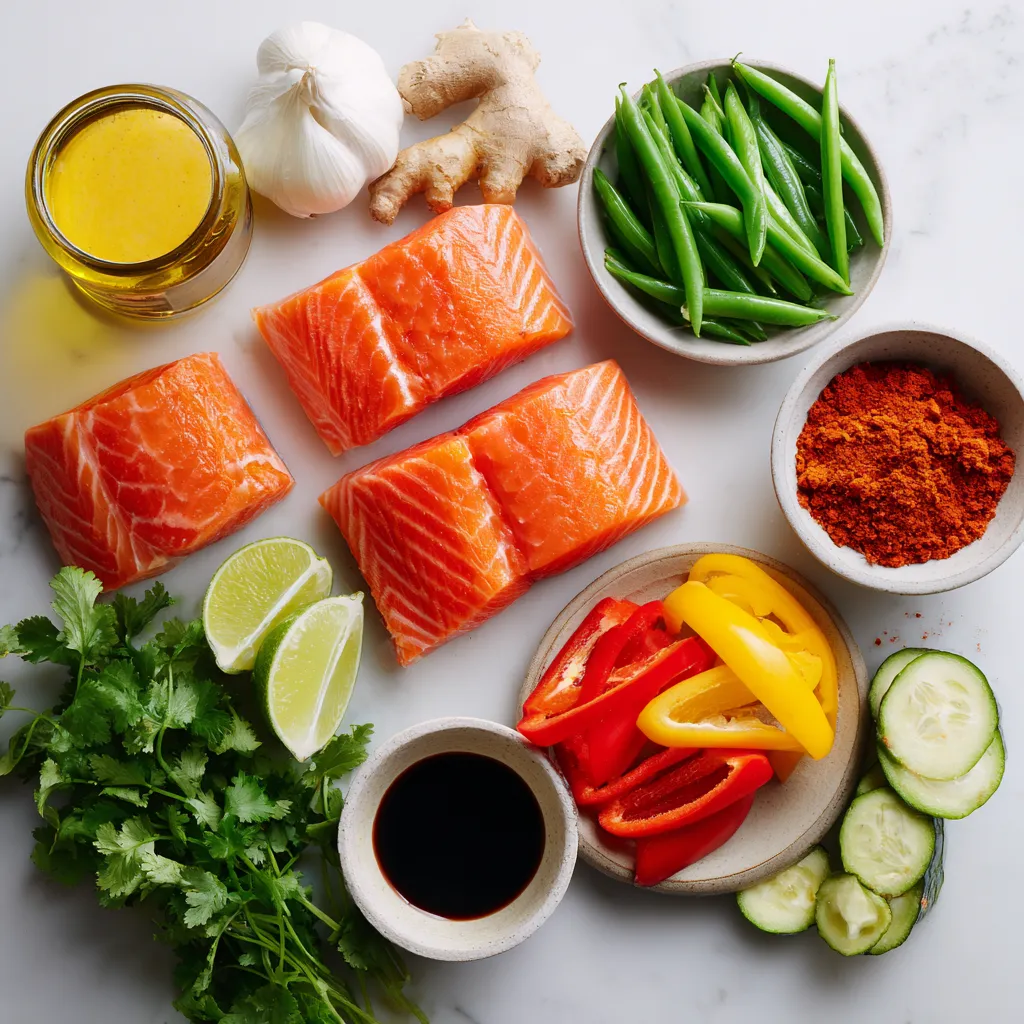 These ingredients make a rich, creamy, and flavorful dish. The salmon fillets provide protein. The coconut milk gives a smooth base. The red curry paste adds a spicy kick. Fresh ginger and garlic create a warm aroma.