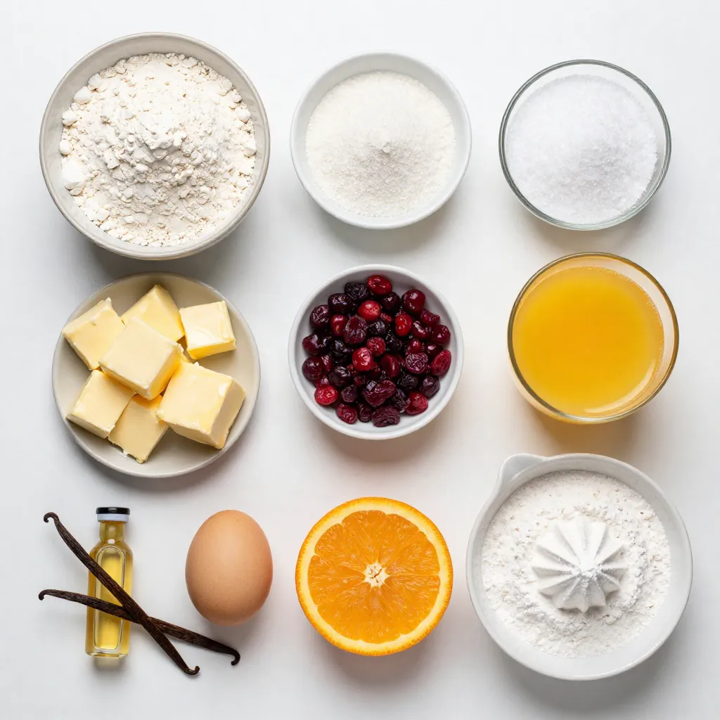- 2 cups all-purpose flour - 1/3 cup granulated sugar - 1 tablespoon baking powder - 1/2 teaspoon salt - 1/2 cup unsalted butter, chilled and cubed - 1/2 cup dried cranberries - Zest of 1 medium orange - 1/2 cup heavy cream - 1 large egg - 1 teaspoon pure vanilla extract - 1/2 cup powdered sugar (for glaze) - 1-2 tablespoons orange juice (for glaze) Each ingredient plays a key role in the scone's texture and flavor. Use precise measurements for best results. - Flour provides the structure. - Sugar adds sweetness. - Baking powder helps the scones rise. - Salt enhances flavor. - Butter creates flakiness. - Dried cranberries add tartness. - Orange zest gives that fresh citrus touch. - Heavy cream keeps the scones rich and moist. - Egg binds everything together. - Vanilla extract adds warmth. - Powdered sugar and orange juice make the glaze sweet and tangy. You can mix it up based on what you have at home. Here are some ideas: - Replace all-purpose flour with whole wheat flour for a nuttier taste. - Swap granulated sugar for brown sugar for a hint of caramel flavor. - Use coconut oil instead of butter for a dairy-free option. - If you don't have dried cranberries, try raisins or chopped apricots. - For a lighter glaze, substitute orange juice with lemon juice. These changes can create unique flavors while keeping the scone's basic goodness intact. {{ingredient_image_1}} First, set your oven to 400°F (200°C). While it heats, grab a baking sheet and line it with parchment paper. This step helps the scones bake evenly and prevents sticking. You want to make sure your scones come out perfectly golden and easy to serve. In a large bowl, whisk together the dry ingredients. Start with 2 cups of all-purpose flour, then add 1/3 cup of granulated sugar, 1 tablespoon of baking powder, and 1/2 teaspoon of salt. Mix well. Next, take 1/2 cup of cold, cubed butter. Add this to your dry mix. Use your fingers or a pastry cutter to combine until it looks like coarse crumbs. Now, fold in 1/2 cup of dried cranberries and the zest of one medium orange. In a separate bowl, mix your wet ingredients. Whisk together 1/2 cup of heavy cream, 1 large egg, and 1 teaspoon of pure vanilla extract. Pour this wet mix into your dry mix. Stir gently until just combined. Don’t over-mix; your dough should be shaggy but not smooth. Turn your dough onto a lightly floured surface. Knead it gently for about 30 seconds. Pat it into a circle, about 1 inch thick. Cut this into 8 wedges and place them on your prepared baking sheet. Bake the scones in your preheated oven for 15 to 18 minutes. They should turn lightly golden on top. While the scones bake, prepare the glaze. In a small bowl, whisk together 1/2 cup of powdered sugar and 1-2 tablespoons of orange juice until smooth. Once the scones cool for a few minutes, drizzle the glaze on top. Enjoy the sweet and zesty flavor of your cranberry orange scones! To make flaky scones, keep your butter cold. Cold butter creates pockets of steam in the dough. This helps the scones rise and stay light. Use a pastry cutter or your fingers to mix the butter into the flour. Aim for a crumbly texture, like sand. Do not over-mix the dough; it should be slightly shaggy. Also, make sure to handle the dough gently when shaping. This keeps the scones tender. One common mistake is overworking the dough. This can make your scones tough. Remember, mix until just combined. Another mistake is using warm butter. Always use chilled butter for the best results. Also, watch the baking time. If you bake them too long, they may dry out. Lastly, don’t forget to preheat your oven. This ensures even baking right from the start. You can boost flavors in your scones easily. Add nuts, like walnuts or pecans, for crunch. For a twist, try adding white chocolate chips. They pair well with cranberries. You can also add spices like cinnamon or nutmeg for warmth. If you love citrus, add more orange zest to enhance the flavor. Each ingredient brings a new layer to your scones. Feel free to experiment and find your favorite mix! Pro Tips Chill Your Ingredients: Ensure your butter and cream are chilled before mixing. This helps create flaky layers in your scones. Avoid Over-Mixing: Mix the dough until just combined. Over-mixing can lead to tough scones. Create Even Shapes: Use a sharp knife or bench scraper to cut the dough into wedges for uniform baking and presentation. Add Extra Zest: For a more intense orange flavor, consider adding a bit more orange zest to the dough. {{image_2}} You can make scones more fun by adding different fruits or nuts. Try using blueberries, raspberries, or chopped apples. Each fruit brings its own flavor and texture. If you love nuts, consider adding chopped walnuts or pecans. They add crunch and richness. Mix and match to find your favorite combinations. Get creative with flavors! Instead of just orange, try adding lemon zest for a tangy twist. You can also mix vanilla with almond extract for a warm note. Spices like cinnamon or nutmeg add warmth and depth. Experiment until you find a flavor you love. The possibilities are endless! While the orange glaze is delicious, you can switch it up. A lemon glaze adds a bright kick. You can also use a simple milk glaze for a sweeter taste. For a chocolate touch, melt dark chocolate and drizzle it over the scones. Each glaze gives a new twist to your treats! To keep your scones fresh, store them in an airtight container. I recommend placing parchment paper between layers to prevent sticking. This method helps maintain their fluffy texture. If you store them at room temperature, they will last for about two days. After that, they may start to lose their charm. For longer storage, freezing is the best option. Wrap each scone in plastic wrap, then place them in a freezer bag. This keeps them safe from freezer burn. They can last up to three months in the freezer. When you're ready to enjoy, just take out the desired amount. To reheat your scones, you can 