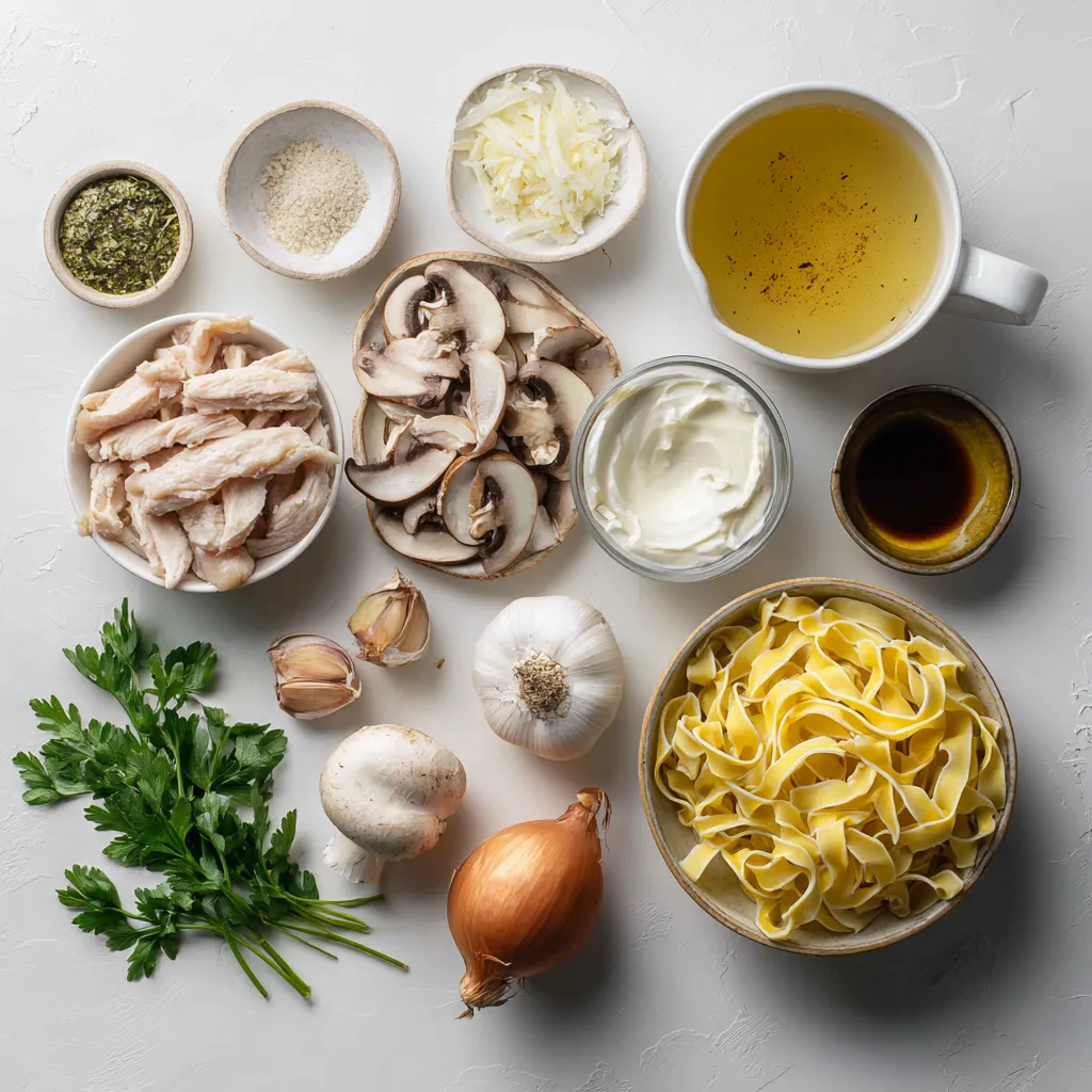 Each ingredient plays a key role in the dish. The chicken breast offers protein, while mushrooms add earthy flavor. Onions and garlic bring aromatic warmth. Chicken broth gives depth, and sour cream adds creaminess. Olive oil helps with cooking, and flour thickens the sauce. Dijon mustard gives a tangy kick. Finally, salt, pepper, and parsley enhance the overall taste.