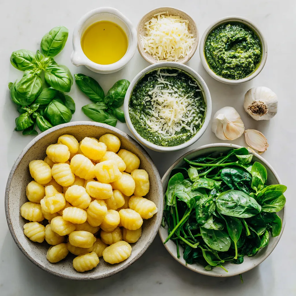 For this recipe, I use 1 pound of gnocchi. This amount serves about four people. I add 2 cups of fresh spinach for color and nutrients. The basil pesto can be store-bought or homemade, but I often make my own for better taste. I like to use 1 cup of heavy cream to give a nice richness. The grated Parmesan cheese adds a savory kick, so I use 1/2 cup. A tablespoon of olive oil helps sauté the garlic. I also use 2 cloves of minced garlic for flavor. Finally, I season with salt and pepper to taste.