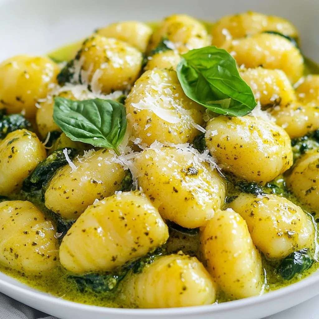 A delicious and creamy dish featuring potato gnocchi, fresh spinach, and basil pesto.