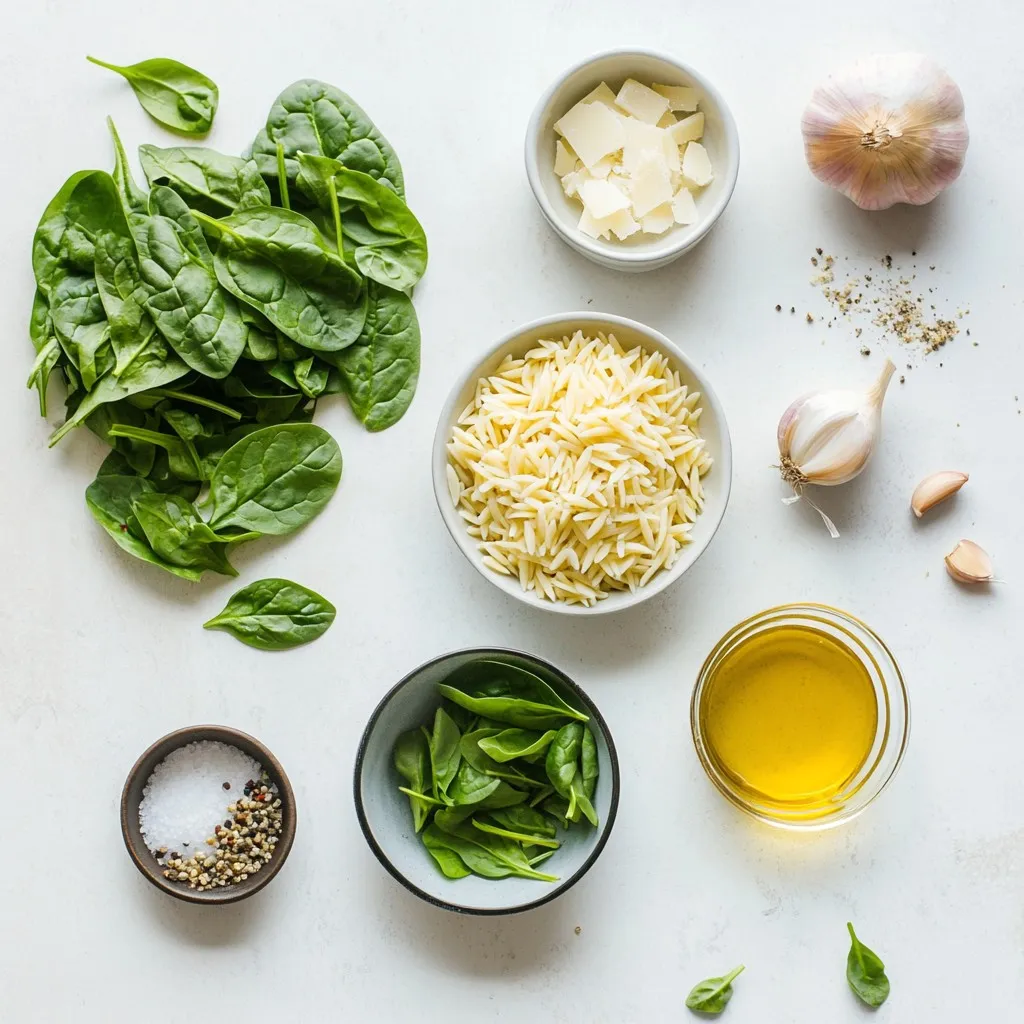 To make this creamy spinach and orzo dish, gather these ingredients: - 1 cup orzo pasta - 2 cups fresh spinach, roughly chopped - 1 cup heavy cream - 1 cup vegetable broth - 1 tablespoon olive oil - 1 small onion, finely chopped - 2 garlic cloves, minced - 1/2 cup grated Parmesan cheese - Salt and pepper, to taste - Optional: A pinch of nutmeg You will need a few simple tools to prepare this meal: - A large skillet - A wooden spoon or spatula - A measuring cup - A knife and cutting board This dish serves four people. Each serving has: - Calories: About 450 - Protein: 12g - Carbohydrates: 45g - Fat: 25g - Fiber: 2g - Sodium: Varies with added salt This creamy spinach and orzo dish is not only tasty but also brings some good nutrients to your table. It combines carbs, healthy fats, and protein to keep you feeling full and satisfied. {{ingredient_image_1}} Start by gathering your ingredients. You will need: - 1 cup orzo pasta - 2 cups fresh spinach, roughly chopped - 1 cup heavy cream - 1 cup vegetable broth - 1 tablespoon olive oil - 1 small onion, finely chopped - 2 garlic cloves, minced - 1/2 cup grated Parmesan cheese - Salt and pepper, to taste - Optional: A pinch of nutmeg Chop the onion and garlic. You want them small enough to mix well but not too small. 1. Heat the olive oil in a large skillet over medium heat. 2. Add the chopped onion. Sauté it for about 3-4 minutes until it looks clear. 3. Stir in the minced garlic. Cook it for one more minute. Watch out, so it does not burn. 4. Add the orzo pasta to the skillet. Stir it well to coat the grains with oil and onion. 5. Pour in the vegetable broth. Bring it to a light simmer. Cook for about 8-10 minutes, stirring now and then. You want the orzo to be slightly firm, or al dente. 6. Turn the heat down low. Slowly mix in the heavy cream until it blends completely. 7. Fold in the chopped spinach. Cook it until it wilts, which takes about 2-3 minutes. 8. Stir in the grated Parmesan cheese. Add salt, pepper, and nutmeg if you want. Adjust to your taste. 9. Let it cook for 2 more minutes. This helps the sauce thicken a bit. Once everything is cooked, remove the skillet from the heat. Let it sit for a minute. This gives the flavors time to settle. Serve the creamy spinach and orzo in shallow bowls. You can sprinkle more Parmesan cheese and some cracked pepper on top for a nice look. Enjoy your tasty dinner delight! To get that smooth, dreamy texture in your creamy spinach and orzo, follow these steps. First, use heavy cream. It gives the dish richness that lighter creams can't match. Once you add the cream, keep the heat low. This helps it blend well without curdling. Stir slowly to mix in the spinach and cheese. This way, everything melts together nicely. If you want a thicker sauce, let it cook a bit longer. Just remember to stir often to avoid sticking. Seasoning makes a big difference in flavor. Start with salt and pepper. They enhance the natural taste of the ingredients. Then, add a pinch of nutmeg if you like. Nutmeg gives a warm, cozy note. You can also try garlic powder for more garlic flavor. If you want a kick, add red pepper flakes. Fresh herbs like basil or parsley can brighten the dish. Taste as you go to find your perfect mix. Avoid cooking the orzo too long. If overcooked, it becomes mushy and loses its bite. Make sure to stir the orzo while it cooks. This helps it cook evenly. Also, don’t skip the resting time after cooking. Letting it sit for a minute helps the sauce thicken. Lastly, don’t forget to taste before serving. This checks if it needs more seasoning. Following these tips will help you create a creamy, flavorful dish every time. Pro Tips Use Fresh Spinach: Fresh spinach enhances the flavor and texture of the dish, making it more vibrant and nutritious. Flavor Boost: Adding a pinch of nutmeg not only complements the creaminess but also adds a subtle depth to the dish. Perfectly Cooked Orzo: Keep an eye on the orzo while it simmers, stirring occasionally to prevent it from sticking to the bottom of the skillet. Serving Suggestion: Garnish with freshly cracked pepper and additional Parmesan cheese for a restaurant-quality presentation. {{image_2}} You can turn creamy spinach and orzo into a heartier meal by adding protein. Chicken and shrimp work great. For chicken, use cooked, diced pieces. You can add it when you mix in the spinach. For shrimp, sauté them in the skillet before adding the orzo. Cook until they turn pink, then follow the rest of the recipe. Both options add a nice texture and flavor to the dish. If you want to change up the veggies, there are many options. You can try kale instead of spinach. It gives a richer flavor. Another choice is broccoli. Just chop it into small pieces and add it with the orzo. You can even mix in peas for a sweet bite. These swaps keep the dish fresh and fun. You can make this dish vegan without losing its creamy charm. Replace heavy cream with coconut milk or a plant-based cream. Use nutritional yeast instead of Parmesan for a cheesy taste. Also, swap the vegetable broth for a homemade vegan broth. These changes keep the dish rich and delicious while being plant-based. Store your creamy spinach and orzo in an airtight container. Let it cool down first. Once cool, cover it tightly and place it in the fridge. This dish will stay fresh for up to three days. To reheat, take out the portion you want. Place it in a skillet over low heat. Add a splash of vegetable broth or cream to help bring back the creamy texture. Stir often until heated through. You can also use a microwave. Place it in a microwave-safe bowl. Heat in short bursts, stirring in between, until warm. Freezing is a great option if you have extra. For best results, freeze it in individual portions. Use freezer-safe bags or containers. Make sure to remove as much air as possible. This dish can last up to three months in the freezer. Thaw it in the fridge overnight before reheating. Yes, you can use other small p