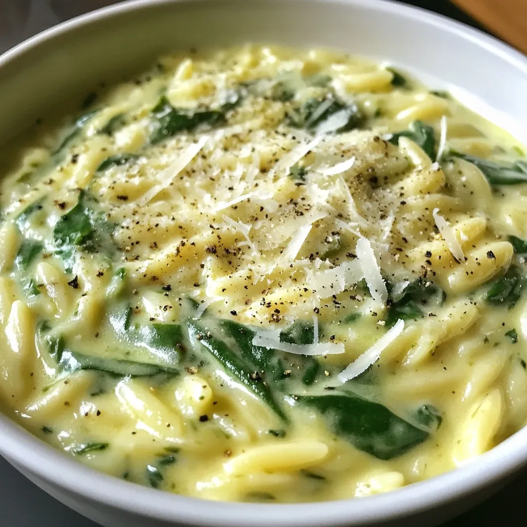 A delicious and creamy dish featuring orzo pasta and fresh spinach, perfect for a comforting meal.