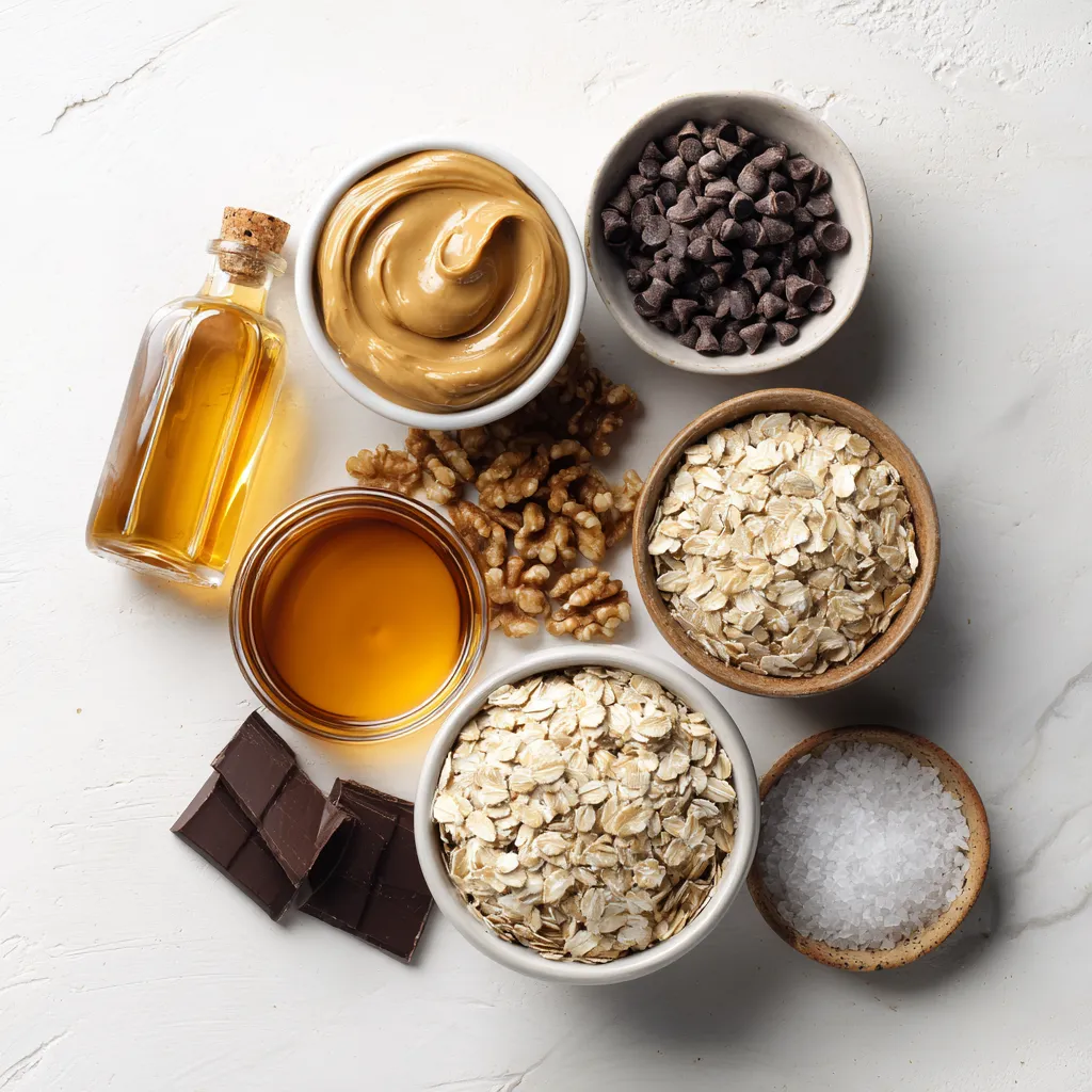 Start by gathering all your ingredients. You will need peanut butter, honey, oats, dark chocolate chips, walnuts, vanilla, and sea salt. This recipe is easy and quick. You can finish it in about 15 minutes.