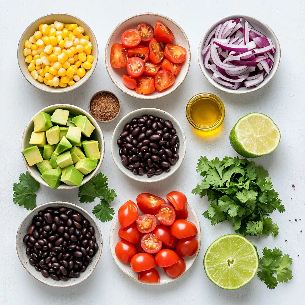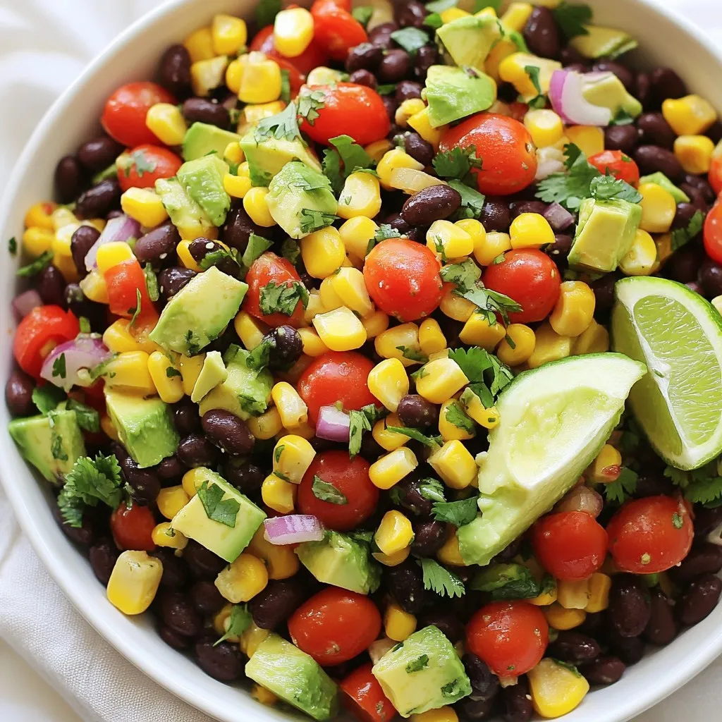 - 1 can (15 oz) black beans, rinsed and drained - 1 can (15 oz) sweet corn, drained - 1 red bell pepper, diced - 1 small red onion, finely chopped - 1 avocado, diced - 1/2 cup cherry tomatoes, halved - 1/4 cup fresh cilantro, chopped - 2 limes (juice only) - 2 tablespoons olive oil - 1 teaspoon cumin - 1/2 teaspoon chili powder - Salt and pepper to taste To make this salad pop, you need fresh, vibrant ingredients. Black beans give a hearty base. Sweet corn adds a nice crunch. The red bell pepper brings a sweet, refreshing bite. Red onion gives a sharp contrast. Avocado adds creaminess. Cherry tomatoes add a burst of flavor. Fresh cilantro brightens everything up. For the dressing, you need lime juice, olive oil, cumin, and chili powder. These ingredients blend well. They make the salad tangy and zesty. Don't forget salt and pepper! They enhance all the flavors. - Additional cilantro - Lime wedges If you want to take it up a notch, add more cilantro. Lime wedges on the side make it fun. They add extra zest. These garnishes make your dish look festive and colorful! {{ingredient_image_1}} First, grab a large mixing bowl. Add one can of rinsed black beans and one can of drained sweet corn. Mix them well to combine. Next, chop the red bell pepper and finely chop the red onion. Add these to the bowl. Then, slice the cherry tomatoes in half and fold them into the salad. Lastly, gently add the diced avocado and chopped cilantro. Be careful not to mash the avocado. Now, let’s make the dressing. In a small bowl, squeeze the juice from two limes. Add two tablespoons of olive oil, one teaspoon of cumin, and half a teaspoon of chili powder. Season with salt and pepper. Whisk everything together until it blends well. Pour this dressing over the salad mix. Toss gently to coat all the ingredients. After mixing, let the salad sit for about 10 to 15 minutes. This helps all the flavors meld together. For a vibrant look, serve the salad in a large bowl. You can also garnish with extra cilantro and lime wedges. For a fun twist, serve in individual cups for a festive touch. Enjoy the fresh and colorful flavors! To get the best taste from your Fiesta Black Bean Corn Salad, start with seasoning. You can add salt and pepper to fit your taste. This lets you control the flavor. If you want more spice, add extra chili powder. Let the salad sit for about 10 to 15 minutes before serving. This resting time helps all the flavors blend well. The lime juice soaks into the beans and veggies, making them extra tasty. If you don't have black beans, you can use pinto beans or chickpeas instead. These options still give you great taste and texture. For corn, frozen corn works well too. Just thaw it before adding. You can swap out veggies based on the season. In summer, add fresh zucchini or cucumbers. In fall, try roasted sweet potatoes for a warm twist. These swaps keep the salad fresh and fun. For leftovers, store the salad in an airtight container. This keeps it fresh longer. Place it in the fridge, where it lasts for about 3 days. When you store it, the flavors may change a bit. The avocado can turn brown, but it will still taste good. If you want to keep it looking fresh, add the avocado just before you serve it. Pro Tips Fresh Ingredients: Using fresh ingredients, especially the lime and cilantro, will elevate the flavor of this salad significantly. Chill Before Serving: Allowing the salad to chill for a bit enhances the flavors. Make it ahead of time and refrigerate for best results. Customize Your Veggies: Feel free to add other vegetables like diced cucumbers or jalapeños for added crunch and spice! Perfect Avocado: To prevent the avocado from browning, add it just before serving, or toss it with a little lime juice for extra protection. {{image_2}} You can boost this salad's nutrition by adding proteins. Avocado adds creaminess and healthy fats. You can also add grilled chicken for a heartier meal. If you want more black beans, try using two cans instead of one. This will make the salad richer in flavor and protein. For a spicy kick, incorporate jalapeños. Just chop them finely and mix them in. You can also add hot sauce to the dressing. This will give the salad a zesty edge you’ll love. Make sure all your ingredients are vegan and gluten-free. Use a gluten-free dressing if you want to avoid gluten. You can serve this salad with corn tortillas or lettuce wraps for a fun twist. - Overall calories: Each serving has about 180 calories. - Macronutrient distribution: You get 8g of protein, 6g of fat, and 27g of carbs. Black beans are great for you. They are full of protein and fiber. This helps keep you full and aids digestion. Corn adds sweetness and vitamins. It has antioxidants that can protect your body. The veggies in the salad also provide health perks. Red bell peppers are high in vitamin C. They boost your immune system. Red onions have compounds that may lower blood pressure. Avocado gives you healthy fats and helps with skin health. You can reduce calories by using less olive oil or skipping the avocado. Instead, add more veggies like spinach or cucumbers. This keeps the salad fresh and low in calories. You can also use low-sodium black beans to cut back on salt. Fiesta Black Bean Corn Salad lasts about 3 to 5 days in the fridge. To store it properly, place it in an airtight container. Make sure to keep the salad cool, away from heat. If you see any signs of spoilage, it’s best to toss it out. Yes, you can make this salad a day ahead. Just leave out the avocado until serving. This keeps it fresh and green. You can mix all other ingredients and store them in the fridge. When you are ready to serve, add the avocado and toss. This way, the salad stays tasty and crunchy. Fiesta Black Bean Corn Salad pairs well with many dishes. Try serving it with grilled chicken or fish for a complete meal. It also goes great with tacos or quesadillas. For a lighter option, serve it with tortilla chips for a fun dip. Enjoy