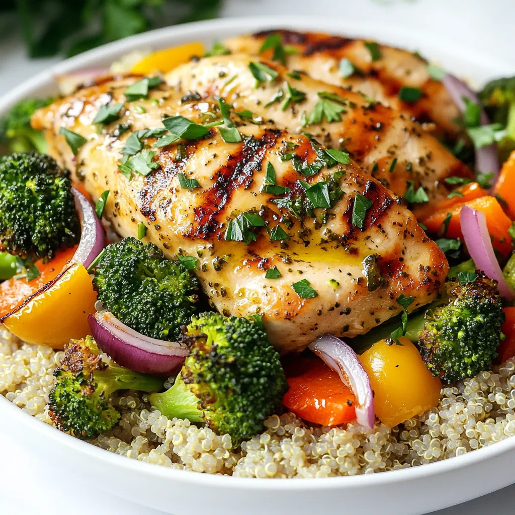 After baking, remove the pan from the oven. Let it cool for a few minutes. Serve the chicken and veggies over 1 cup of cooked quinoa or brown rice. For a nice touch, sprinkle some chopped fresh parsley on top. You can also drizzle a little olive oil and lemon juice for extra flavor. Enjoy your meal!