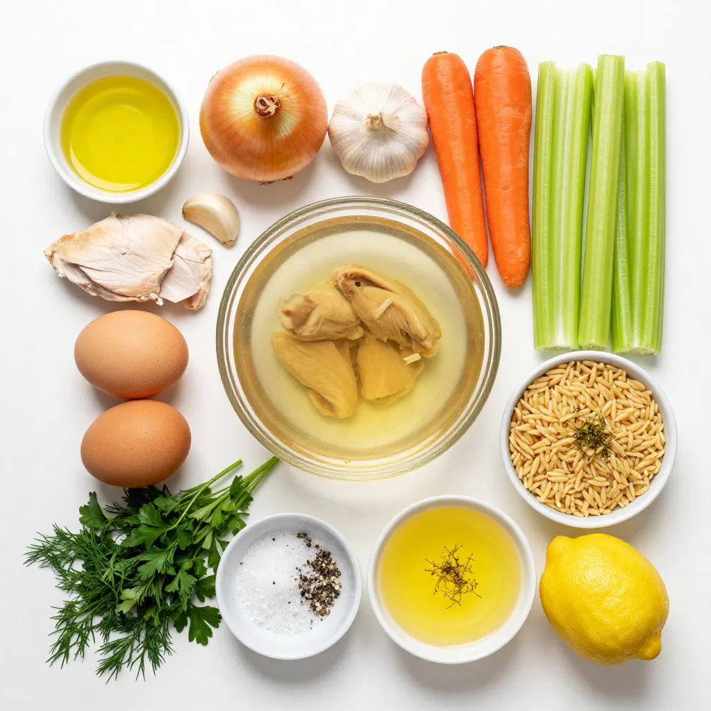 Greek Lemon Chicken Soup is a dish full of flavor and comfort. To make it, gather your ingredients. The base starts with olive oil, onion, garlic, carrots, and celery. These veggies add depth and sweetness to the soup.