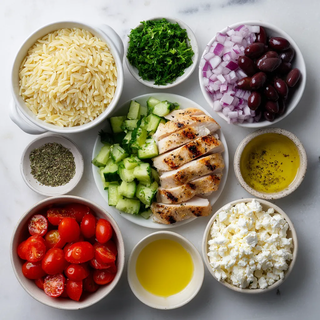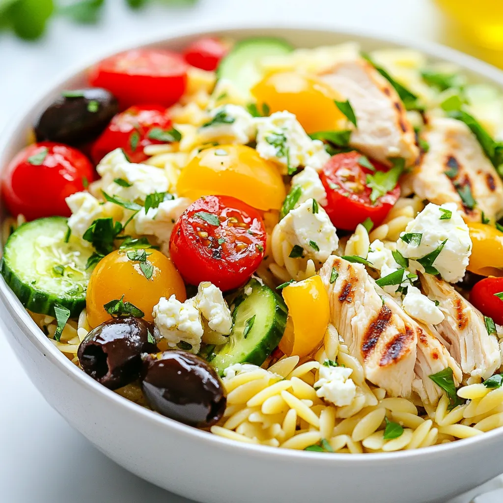 - 1 cup orzo pasta - 2 grilled chicken breasts, sliced - 1 cup cherry tomatoes, halved - 1 cucumber, diced - 1/2 red onion, finely chopped - 1/2 cup black olives, pitted and sliced - 1/2 cup feta cheese, crumbled - 1/4 cup fresh parsley, chopped - 3 tablespoons olive oil - 2 tablespoons lemon juice - 1 teaspoon dried oregano - Salt and pepper to taste You can change this salad to fit your taste. Here are some ideas: - Add bell peppers for crunch. - Use grilled shrimp instead of chicken for a seafood twist. - Swap feta with goat cheese for a creamier taste. - Toss in some avocado for extra creaminess. To make this salad, you will need: - A large pot to cook the orzo. - A mixing bowl for the salad. - A small bowl for the dressing. - A whisk to mix the dressing. - A cutting board and knife for chopping veggies. - A measuring cup and spoons for accurate measurements. {{ingredient_image_1}} Start by boiling a pot of salted water. Add the orzo pasta to the water. Cook it for about 8 to 10 minutes or until it feels firm but tender. This is called al dente. Once cooked, drain the orzo in a colander. Rinse it under cold water to stop the cooking. This step helps keep the orzo from getting mushy. For the chicken, preheat your grill to medium heat. Season the chicken breasts with salt and pepper. Grill the chicken for about 6 to 7 minutes on each side. You want it to be fully cooked and have nice grill marks. When done, take the chicken off the grill and let it rest for a few minutes. Then, slice it into bite-sized pieces. In a large bowl, combine the cooked orzo, grilled chicken slices, cherry tomatoes, diced cucumber, finely chopped red onion, sliced black olives, and crumbled feta cheese. In a smaller bowl, whisk together olive oil, lemon juice, dried oregano, salt, and pepper. Pour this dressing over the salad mix and toss gently. Make sure everything gets coated well. Finally, sprinkle fresh parsley on top for color and taste. If you have time, chill the salad in the fridge for 20 to 30 minutes. This helps the flavors blend together nicely. To cook orzo pasta, start with a big pot of water. Add salt to the water. This boosts the flavor of the pasta. Bring the water to a boil. Add the orzo and stir it. Cook for about 8 to 10 minutes. You want it to be al dente, which means it is firm but not hard. When it's done, drain the orzo. Rinse it under cold water. This stops the cooking. It keeps the orzo from becoming mushy. Grilling chicken gives it a nice smoky taste. First, marinate the chicken for at least 30 minutes. Use olive oil, lemon juice, salt, and pepper for great flavor. Preheat the grill to medium-high heat. Place the chicken on the grill and cook for 6-7 minutes on each side. Check that the chicken is cooked through. The inside should be 165°F. Once done, let it rest for a few minutes before slicing. This keeps the juices inside the chicken. The dressing can make or break your salad. For this Greek orzo salad, mix olive oil, lemon juice, dried oregano, salt, and pepper. Whisk these together in a small bowl. Taste it to see if you like the balance. You can add more lemon juice for tang or more olive oil for richness. Pour the dressing over your salad and toss it well. Every bite should be coated in flavor. Let the salad chill for 20-30 minutes. This helps the flavors blend and taste even better. Pro Tips Cook Orzo Al Dente: Ensure you cook the orzo until it's al dente for the best texture. This will help it hold up well in the salad and not become mushy. Chill for Flavor: Allowing the salad to chill in the refrigerator for 20-30 minutes enhances the flavors as they meld together, resulting in a more delicious dish. Customize Your Veggies: Feel free to add or substitute your favorite vegetables, such as bell peppers or spinach, to make the salad your own. Fresh Herbs Matter: Use fresh herbs like parsley or dill for a brighter taste. Dried herbs can be used in a pinch, but fresh really elevates the dish. {{image_2}} You can make a great vegetarian version of this salad. Simply leave out the chicken. Replace it with extra chickpeas or grilled zucchini. This way, you still get protein and flavor without meat. You can also add bell peppers for more color and crunch. Use the same dressing for added zest. If you need a gluten-free dish, use gluten-free orzo pasta. Many brands make great alternatives. You can also swap orzo for quinoa or rice. Both offer a nice base and fit well with the other flavors. Just make sure your olives and feta are gluten-free too. Feel free to get creative with your ingredients. Add artichoke hearts for a tangy kick. You can also toss in some spinach for extra greens. If you like spice, try adding jalapeños or red pepper flakes. You can adjust the dressing by adding more lemon juice for brightness or a bit of balsamic vinegar for depth. These changes can really make the salad shine! To keep your Greek Orzo Salad fresh, place it in a sealed container. Make sure to cover it tightly to prevent air from getting in. If you can, separate the dressing from the salad. This will help keep the orzo and veggies crisp. Use glass or plastic containers with tight lids for storage. Glass containers are great because they do not stain or hold odors. If you have smaller containers, they work well for single servings. This makes it easy to grab a quick meal. Your Greek Orzo Salad will stay good for about three to four days in the fridge. After that, the flavors may fade and the veggies can get mushy. Always check for any off smells or changes in texture before eating leftovers. If you see any signs of spoilage, it's best to toss it. Yes, you can make Greek Orzo Salad ahead of time. This salad tastes even better after sitting. The flavors mix well when it rests. I suggest making it a few hours in advance. Just store it in the fridge until you're ready to serve. If you don't have feta cheese, try goat cheese or ricotta. Both add creaminess and taste great! For a dairy-free option, use f