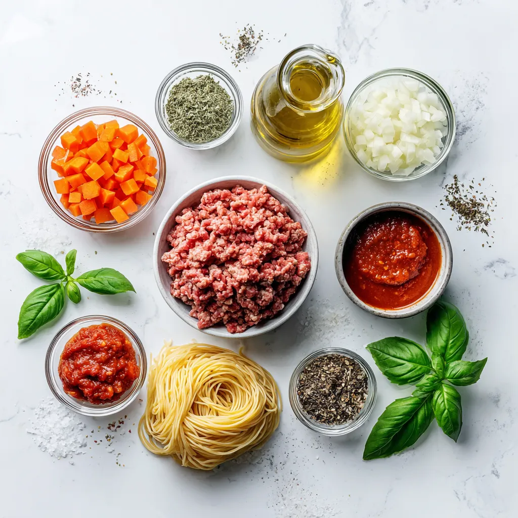 For this rich and flavorful Italian Beef Bolognese sauce, you need the right ingredients. I start with ground beef, which brings a hearty taste. Aromatic vegetables like onion, garlic, carrot, and celery add depth and sweetness. Canned crushed tomatoes and tomato paste provide thickness and flavor. Beef broth makes the sauce rich and comforting.