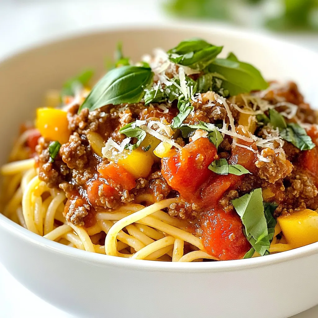 Herbs and seasonings like oregano, basil, salt, and pepper enhance the dish. Olive oil is key for sautéing the vegetables and beef. For garnishing, I use fresh basil and grated Parmesan cheese, which add a lovely touch. Finally, choose spaghetti or any pasta you enjoy. The right pasta makes all the difference in your meal.