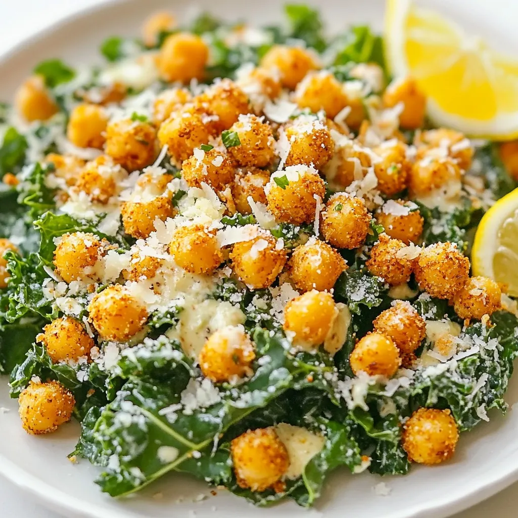 Once the chickpeas are done baking, let them cool for a minute. Pour the tahini dressing over the massaged kale. Mix well, ensuring every leaf is coated. Add the crispy chickpeas on top. Finish with grated Parmesan cheese or nutritional yeast if you prefer vegan. Sprinkle freshly ground pepper and toss in croutons if you like. Serve right away with lemon wedges on the side for an extra zesty touch. Enjoy your tasty Kale Caesar Salad!