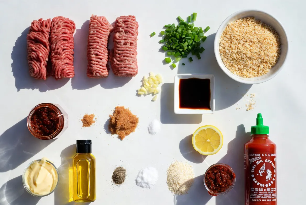 In a large bowl, mix the ground beef or chicken, panko breadcrumbs, and chopped green onions. Add minced garlic, soy sauce, gochujang, sesame oil, brown sugar, salt, black pepper, and cornstarch. Use your hands to blend everything well. This step is key for even flavor in every bite.