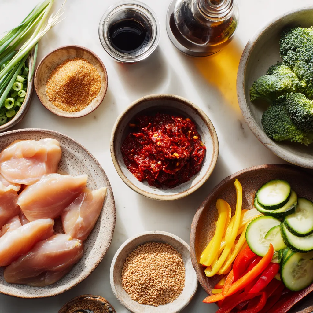 Gather these ingredients before you start cooking. The chicken gives the dish its heartiness. Gochujang and gochugaru add that spicy kick. Soy sauce and sesame oil bring depth to the flavor.