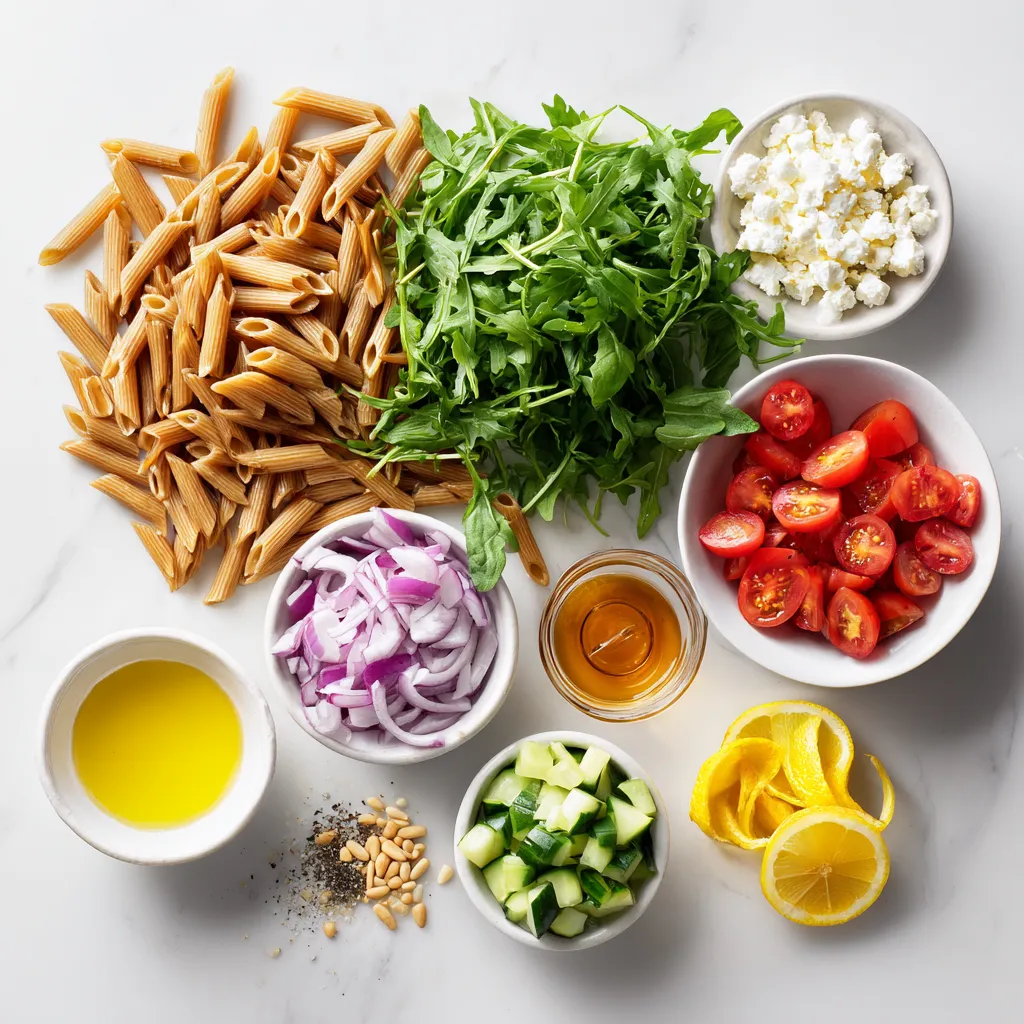 Each ingredient plays a role in making this salad bright and tasty. Whole wheat penne adds fiber and a nutty flavor. Fresh arugula gives a peppery kick. Cherry tomatoes add sweetness, while cucumber brings crunch. Red onion adds sharpness, and feta cheese gives creaminess.