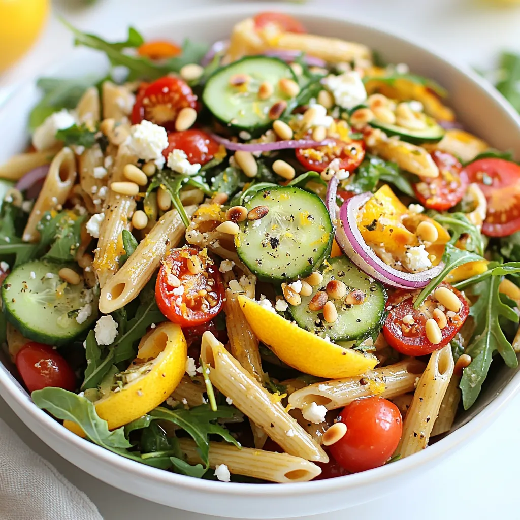 A refreshing pasta salad featuring whole wheat penne, fresh arugula, and a zesty lemon dressing.