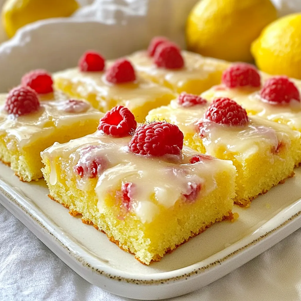 - 2 cups all-purpose flour - 1 ½ cups granulated sugar - 1 tablespoon baking powder - ½ teaspoon salt - 1 cup unsalted butter, softened - 4 large eggs - 1 cup whole milk - Zest of 2 lemons - ¼ cup fresh lemon juice - 1 cup fresh raspberries (plus extra for garnish) - 1 teaspoon vanilla extract - 1 cup powdered sugar (for frosting) - 2 tablespoons lemon juice (for frosting) I use standard cups for dry and wet ingredients. Use a tablespoon for baking powder and salt. A teaspoon works well for vanilla extract. For the raspberries, I measure them by the cup. This way, you get the right amount and balance of flavors. If you need to change some ingredients, here are good options: - Replace all-purpose flour with a gluten-free blend for gluten-free needs. - Use coconut oil or vegetable oil if you don't have butter. - For a dairy-free cake, substitute milk with almond or soy milk. - If you cannot find fresh raspberries, frozen ones work too. Just be sure to thaw and drain them first. - You can use lemon zest from a jar if fresh lemons are not available. These substitutions help maintain the taste while fitting your needs. {{ingredient_image_1}} Start by preheating your oven to 350°F (175°C). This is key for even baking. Next, grab a 12x17 inch sheet cake pan. Grease and flour it well. This helps the cake release easily after baking. In a large mixing bowl, whisk together these dry ingredients: - 2 cups all-purpose flour - 1 ½ cups granulated sugar - 1 tablespoon baking powder - ½ teaspoon salt In another bowl, take your softened butter and four large eggs. Beat them together until the mix is creamy. This step is crucial for a light cake. Slowly mix in one cup of whole milk, lemon zest from two lemons, a quarter cup of fresh lemon juice, and one teaspoon of vanilla extract. Combine well. Now, gently add the dry mix to the wet mix. Stir until just mixed. Be careful not to overmix; it can make the cake tough. Next, fold in one cup of fresh raspberries. Make sure they spread evenly in the batter. Pour the batter into your prepared sheet pan. Spread it out evenly with a spatula. Place the pan in the oven and bake for 25-30 minutes. Check for doneness by inserting a toothpick in the center. It should come out clean when the cake is ready. Once baked, take the cake out and let it cool in the pan for about 10 minutes. After that, move it to a wire rack to cool completely. This helps keep the cake fluffy and moist. While the cake cools, it's time to make the glaze. In a bowl, mix one cup of powdered sugar with two tablespoons of lemon juice. Stir until the glaze is smooth. If it’s too thick, add a tiny bit more lemon juice. When the cake is cool, pour the lemon glaze over the top. Let it drizzle down the sides for a beautiful look. Finally, add extra fresh raspberries on top for garnish. This adds color and extra flavor. Enjoy your Lemon Raspberry Sheet Cake! One common mistake is overmixing the batter. This can make the cake tough. Mix until just combined for a tender crumb. Another mistake is underbaking. Always check with a toothpick. If it comes out clean, the cake is done. Be sure to cool the cake fully before adding the glaze. Otherwise, it might melt and run off. To enhance the flavor, use fresh lemons and raspberries. Their brightness really shines in this cake. Add a bit more lemon zest for extra zing. You can also use more lemon juice in the glaze. This will give you a punchy lemon flavor. If you want a deeper taste, try adding a pinch of salt to the batter. It brings out the sweetness. For a beautiful finish, cut the cake into neat squares. Arrange them on a colorful platter for a festive look. Top each piece with a fresh raspberry. A sprig of mint adds a nice touch too. You can also dust powdered sugar over the cake for a snowy effect. This makes it look even more inviting and delicious. Pro Tips Fresh Ingredients: Use the freshest raspberries and lemons for the best flavor and texture in your cake. Don't Overmix: When combining wet and dry ingredients, mix just until combined to ensure a tender cake. Cooling Time: Allow the cake to cool completely before adding the glaze for a smooth and even finish. Garnish Wisely: Use mint or edible flowers for garnish to elevate the presentation and add a pop of color. {{image_2}} You can switch up the frosting for your Lemon Raspberry Sheet Cake. Cream cheese frosting adds a rich twist. Just mix 8 oz of cream cheese with 1 cup of powdered sugar and 2 tablespoons of lemon juice. Another great choice is whipped cream. This light topping pairs well with the fruity cake. Simply whip 1 cup of heavy cream with 2 tablespoons of sugar until soft peaks form. To boost the flavors, try adding a bit more lemon zest. You can also mix in a splash of raspberry puree. This adds a fun and fruity taste. Want a twist? Try adding a teaspoon of almond extract. It gives a subtle nutty flavor that complements the lemon and raspberry. For a gluten-free cake, swap the all-purpose flour for a gluten-free blend. Many blends work well in cakes. If you want a vegan version, replace the eggs with flax eggs. Mix 1 tablespoon of ground flaxseed with 2.5 tablespoons of water for each egg. Use plant-based butter and almond milk to keep it dairy-free. These swaps still keep the cake light and flavorful. To keep your leftover Lemon Raspberry Sheet Cake fresh, place it in an airtight container. You can also wrap it tightly in plastic wrap. Store it at room temperature for up to three days. If you prefer, you can refrigerate it for up to a week. Just remember, refrigeration can change the texture slightly. You can freeze this cake for longer storage. First, let it cool completely. Then, slice the cake into squares. Wrap each piece in plastic wrap and place them in a freezer-safe bag. This method helps keep the cake moist. The cake can last in the freezer for up to two months. When you’re ready to enjoy it, just thaw it in the fridge overnight. To reheat your cake, preheat your ove