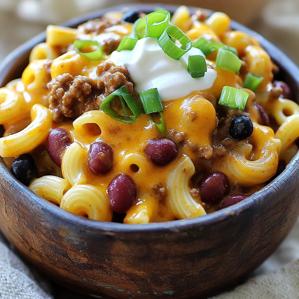 Chili Mac and Cheese pairs well with many sides. A simple green salad adds freshness. You can also serve it with garlic bread for a hearty meal. Cornbread is another tasty option. Try topping with sliced jalapeños or green onions for extra flavor.