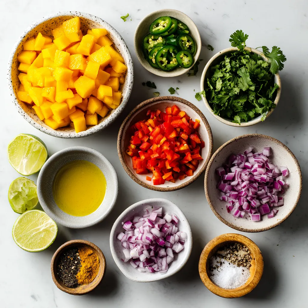 Next, let’s gather the ingredients for the fresh mango salsa. Here’s what you need: