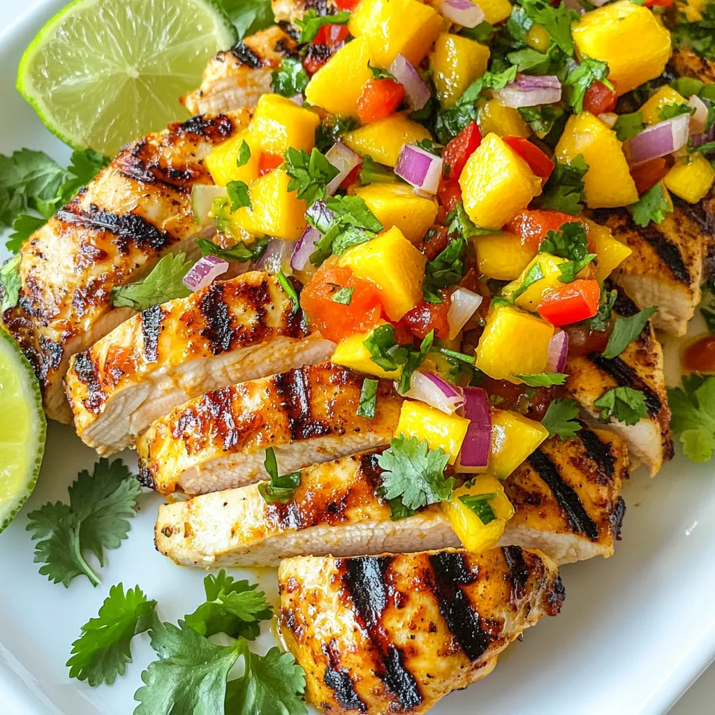 Now, it’s time to cook the chicken! Preheat your grill or skillet to medium-high heat. Once hot, take the marinated chicken breasts and place them on the grill or skillet. Cook each side for about 6 to 7 minutes. You want the chicken to reach an internal temperature of 165°F (75°C). Look for nice grill marks, too. When done, take the chicken off the heat and let it rest for a few minutes. This helps keep the juices in. Slice the chicken and top it with the fresh mango salsa before serving. Enjoy your meal!