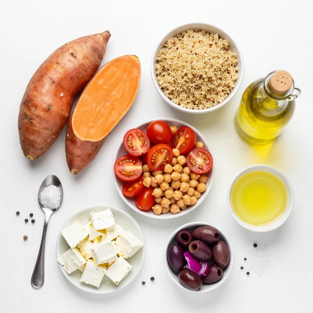 Each ingredient plays a key role in creating the flavors of this dish. Sweet potatoes provide a soft, sweet base. Quinoa adds protein and a nice texture. Chickpeas give heartiness, while cherry tomatoes and red onion add freshness. Feta cheese and olives bring salty, tangy notes. Olive oil and lemon juice brighten the flavors. Garlic powder, salt, and pepper enhance everything. Fresh parsley makes it look beautiful and adds an herbaceous touch.