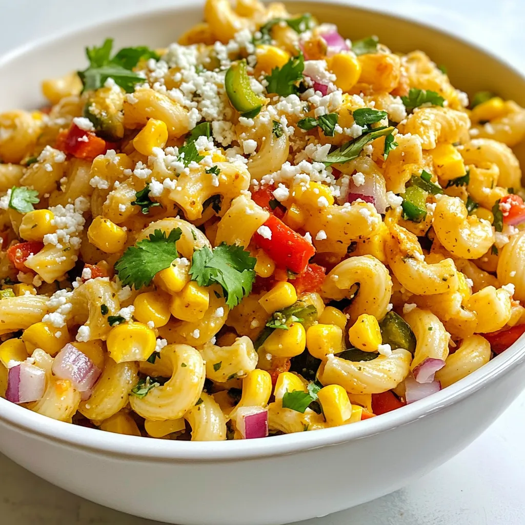 A refreshing pasta salad inspired by Mexican street corn, featuring sweet corn, bell peppers, and a zesty dressing.