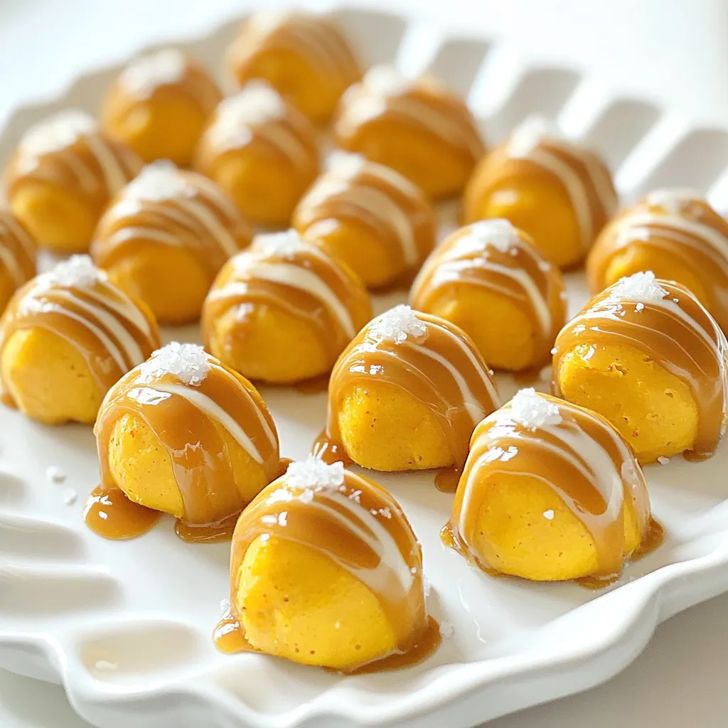 Now for the fun part! Grab your caramel sauce. You can use store-bought or homemade. Drizzle the caramel over each pumpkin bite. You can use a spoon for a casual look or a squeeze bottle for a fancy touch. After drizzling, sprinkle a pinch of sea salt on top. This adds a nice contrast to the sweet caramel. For a beautiful display, arrange the bites on a platter. You can drizzle extra caramel around the bites and add whole pretzels or edible leaves to make it festive.