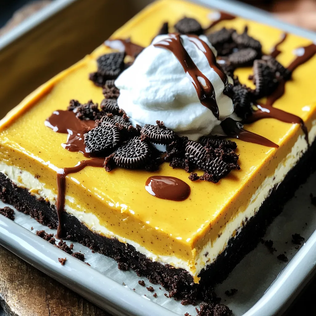 - 24 Oreo cookies (crushed) - 6 tablespoons unsalted butter (melted) - 16 oz cream cheese (softened) - 1 cup pumpkin puree - 1 cup powdered sugar - 1 teaspoon vanilla extract - 1 teaspoon pumpkin spice - 1 cup whipped cream (soft peaks) - Optional: additional crushed Oreo cookies for topping Gathering the right ingredients is key to making these no-bake pumpkin Oreo cheesecake bars. First, you need 24 Oreo cookies. Crush them finely for a smooth crust. Next, melt 6 tablespoons of unsalted butter to combine with the cookies. This mix binds the crust together. You will also need 16 ounces of softened cream cheese. It must be soft for easy mixing. Add 1 cup of pumpkin puree for that rich, autumn flavor. Then, include 1 cup of powdered sugar for sweetness. Next, stir in 1 teaspoon of vanilla extract. This adds a warm touch to the flavor. Don't forget 1 teaspoon of pumpkin spice to enhance the seasonal taste. Finally, use 1 cup of whipped cream, which gives the cheesecake a light texture. If you want, you can sprinkle extra crushed Oreos on top for a fun crunch. These ingredients create a dessert that is creamy, sweet, and full of pumpkin goodness. Each bite will remind you of fall while being super easy to make. First, you need to combine the crushed Oreo cookies and melted butter in a mixing bowl. Mix them well until the mixture looks like wet sand. This is key to making a good crust. Next, take the Oreo mixture and press it firmly into the bottom of a 9x9 inch baking dish. Use a flat object, like a measuring cup, to spread and pack it down evenly. This will help the crust hold its shape when you cut the bars later. In another bowl, start by beating the softened cream cheese until it is smooth. This step is essential to avoid lumps in your cheesecake. Now, mix in the pumpkin puree and powdered sugar. Add the vanilla extract and pumpkin spice too. Stir until everything is well combined and creamy. This filling should taste sweet and have a nice pumpkin flavor. Gently fold in the whipped cream. Use a spatula to mix until no streaks remain. This keeps the filling light and airy, which is what you want for your cheesecake bars. Once mixed, pour the cheesecake filling over the crust in the baking dish. Spread it out evenly so every bite is delicious. Cover the dish with plastic wrap and place it in the fridge. Let it chill for at least 4 hours, or until it's set. This step helps the bars firm up nicely. After the bars are set, cut them into squares for serving. Enjoy these cool treats as is, or add extra crushed Oreo cookies on top for some crunch! To get a firm and packed crust, use 24 crushed Oreo cookies and 6 tablespoons of melted butter. Mix these until it looks like wet sand. Press this mixture into the bottom of your 9x9 inch baking dish. Use a flat object, like a measuring cup, to apply even pressure. This step is key for a solid base that holds up the cheesecake filling. For the best flavor, add 1 teaspoon of vanilla extract and 1 teaspoon of pumpkin spice. These ingredients boost the pumpkin taste and make the dessert shine. You can also experiment with a pinch of nutmeg or cinnamon for extra warmth. Ensure your cream cheese is softened before mixing. This helps achieve that smooth and creamy texture that we all love in cheesecake. For a stunning presentation, consider drizzling chocolate sauce or caramel over the bars before serving. This adds a visual pop and enhances the taste. You can also add a dollop of whipped cream on top for a festive look. For a crunch, sprinkle some additional crushed Oreo cookies on top. This not only looks great but also adds texture to each bite. {{image_2}} You can switch up the crust for this cheesecake. Instead of Oreos, try using graham crackers. They give a nice crunch. You can also use other cookies, like chocolate wafers. For a gluten-free option, use gluten-free cookies. These work well and keep the treat tasty for everyone. Want to add some fun flavors? You can mix in chocolate or caramel. Drizzle chocolate sauce on top for a sweet touch. Adding caramel gives a rich flavor too. You can also play with spices. Try cinnamon or nutmeg for a warm twist. This makes the bars more unique and delicious. When serving these bars, think about ice cream. A scoop of vanilla ice cream pairs perfectly. Whipped cream is another great choice. It adds a nice, fluffy layer. For a seasonal touch, add a sprinkle of cinnamon or nutmeg on top. You can even garnish with fall leaves or other fun decorations to impress your guests. To keep your No-Bake Pumpkin Oreo Cheesecake Bars fresh, store them in the fridge. Place the bars in an airtight container. If you do not have one, cover the dish tightly with plastic wrap. This will help prevent them from absorbing any smells in the fridge. These bars can stay fresh for up to five days. If you notice the bars starting to lose their firmness, it’s time to eat them! To maintain their great taste, avoid cutting them until you are ready to serve. This keeps the edges intact and prevents them from drying out. You can freeze these cheesecake bars for later. If you plan to freeze them, it’s best to freeze them uncut. Wrap the entire dish in plastic wrap and then in foil. This double-layer will protect them from freezer burn. They can last this way for up to three months. When you are ready to enjoy the bars, take them out of the freezer. Let them thaw in the fridge overnight for the best texture. If you cut them before freezing, the bars may lose their nice shape. Be careful when thawing cut bars as they can become mushy. Enjoy these delicious treats any time! These bars last up to five days in the fridge. Store them in an airtight container. If you freeze them, they can last for about two months. Just wrap them well to avoid freezer burn. Yes, you can prep these bars a day in advance. Just make sure to let them set in the fridge for at least four hours. This way, they will be ready when you want to serve them. For a dairy-free op