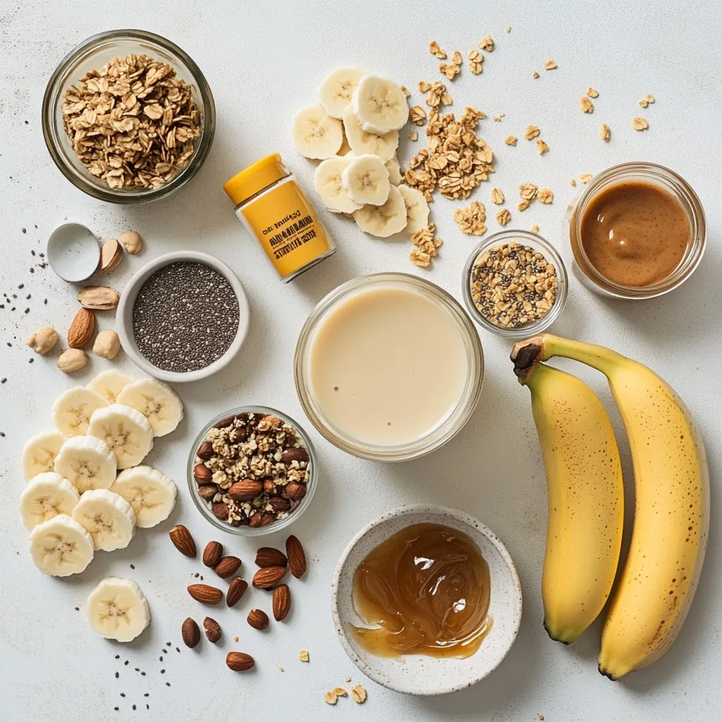 First, gather your ingredients. You need frozen bananas, almond milk, peanut butter, honey or maple syrup, vanilla extract, and cinnamon.