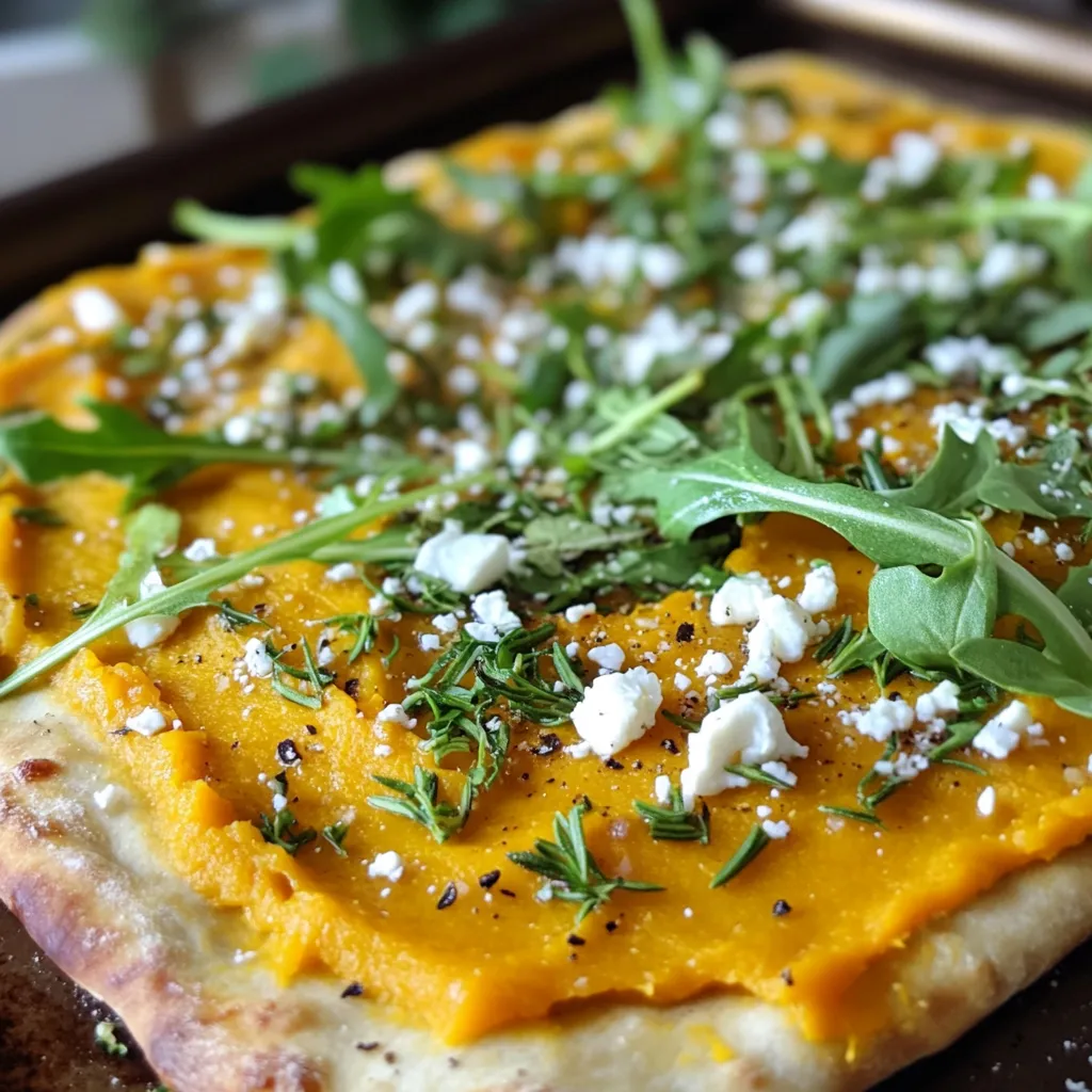 3. Assembly of the flatbread. Take your pre-made flatbread or naan and place it on a baking sheet lined with parchment paper. Spread the pumpkin mix evenly on top, leaving a small border. Sprinkle 1/2 cup of crumbled feta cheese and, if you like, 1/4 cup of goat cheese over the pumpkin.