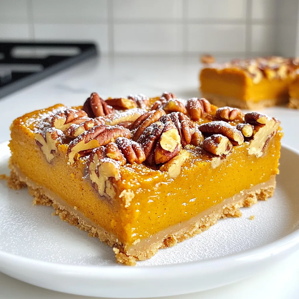 Pumpkin Pecan Pie Bars need a few key ingredients. The star is pumpkin puree. It gives the bars their rich flavor and creamy texture. Pecan nuts add crunch and a buttery taste. Together they create a sweet and savory treat. You also need eggs, which help bind the mixture. Using fresh and high-quality ingredients makes a big difference. Fresh pumpkin puree can enhance the taste. Good quality pecans provide a rich flavor. Always choose the best ingredients for the best results. If you're looking for gluten-free options, you can use almond or coconut flour instead of all-purpose flour. Both work well in this recipe. For a dairy-free version, you can swap heavy cream with coconut cream. You can also use plant-based butter instead of regular butter. These swaps keep the bars tasty while catering to dietary needs. To make these bars, you need some basic tools. A mixing bowl is essential for combining ingredients. A whisk helps blend the pumpkin mixture smoothly. A spatula is useful for spreading the filling evenly. For baking, a 9x13 inch pan is perfect. Lining it with parchment paper makes it easy to remove the bars later. This simple step saves you time and effort when serving your delicious treat. 1. First, preheat your oven to 350°F (175°C). Grab a 9x13 inch baking pan and line it with parchment paper. Leave a little overhang for easy removal later. 2. In a mixing bowl, combine 1 ½ cups of all-purpose flour, ½ cup of brown sugar, and ½ teaspoon of salt. Mix well to ensure the dry ingredients blend completely. 3. Now, stir in ½ cup of melted unsalted butter. Keep mixing until the mixture looks like wet sand. This is your crust! 4. Press the dough firmly into the bottom of the prepared pan. Bake this in the preheated oven for 15 minutes, or until it turns lightly golden. Once done, take it out and let it cool for a bit. 1. In a large bowl, whisk together one can (15 oz) of pumpkin puree, 3 large eggs, 1 teaspoon of vanilla extract, 1 teaspoon of pumpkin spice, and 1 cup of granulated sugar. Mix it until it’s smooth and creamy. 2. Pour this pumpkin mixture over your cooled crust. Spread it evenly across the surface to ensure every bite has that lovely pumpkin flavor. 1. Now, sprinkle 1 cup of chopped pecans over the pumpkin layer. This adds a nice crunch! 2. Drizzle ½ cup of heavy cream over the pecans and pumpkin. Cover it generously for a richer taste. 3. Bake the whole thing for another 25-30 minutes. Check if the center is set by inserting a toothpick; it should come out clean. 4. After baking, let your bars cool completely in the pan on a wire rack. When they cool, lift them out using the parchment paper. Cut them into squares or rectangles and dust with a pinch of nutmeg for extra flair. To make sure your bars bake evenly, keep an eye on the oven temperature. A consistent 350°F is key. Use an oven thermometer if needed. This helps prevent sogginess in your bars. For a perfect crust, press the dough firmly into the pan. You want it to be even and compact. Bake it until it’s lightly golden, then let it cool slightly before adding the filling. Cut your bars into neat squares or rectangles. Use a sharp knife for clean edges. Dust them with powdered sugar or nutmeg for a pretty touch. Serve your bars with whipped cream or vanilla ice cream for a treat. These toppings add a creamy contrast to the spiced pumpkin flavor. One common mistake is overbaking or underbaking your bars. Keep an eye on the time and do the toothpick test. If it comes out clean, your bars are done. Another issue is mismeasuring ingredients. Use a kitchen scale for accuracy. This ensures consistent results every time. Mix the ingredients well, but do not overmix. This keeps your texture just right. {{image_2}} You can easily change the flavor of your bars. Adding chocolate chips gives a rich twist. Try semi-sweet or dark chocolate chips for a deep flavor. Caramel also works well; drizzle it on top for extra sweetness. You can also use different nuts. Walnuts or almonds can replace pecans. Each nut brings a unique taste and texture. If you want vegan options, use flax eggs instead of real eggs. You can mix one tablespoon of flaxseed meal with three tablespoons of water. Let it sit for a few minutes. For a sugar-free version, use a sugar substitute like erythritol. These swaps let everyone enjoy the bars without worry. You can also make lower-calorie versions by using less sugar and butter. Applesauce can replace butter to cut calories. You can tweak the recipe for holidays. For Thanksgiving, add extra spices like cinnamon and cloves. These spices bring out the warm flavors of fall. For Christmas, a hint of peppermint can make your bars festive. The right spices can make your Pumpkin Pecan Pie Bars feel special for every season. To keep your Pumpkin Pecan Pie Bars fresh, store them in an airtight container. Place a piece of parchment paper between layers if you stack them. This prevents sticking and keeps the bars intact. Store the container in the fridge to maintain their flavor and texture. The cool environment helps the bars stay moist and delicious. If you want to save some for later, freezing is a great option. Wrap each bar tightly in plastic wrap. Then, place them in a freezer-safe bag or container. This helps prevent freezer burn. When you're ready to enjoy them, thaw the bars in the fridge overnight. For best texture, avoid microwaving them. Let them come to room temperature before serving. In the fridge, your Pumpkin Pecan Pie Bars last about five days. Keep an eye out for any changes in smell, color, or texture. If the bars look dry or have an off odor, it's best to discard them. Fresh is always best when it comes to these tasty treats! Yes, you can make these bars ahead of time. Bake them and allow them to cool. Then, store them in an airtight container. They stay fresh in the fridge for about four days. This is great for busy days or holiday prep! Check the bars at around 25 minutes of baking. Insert