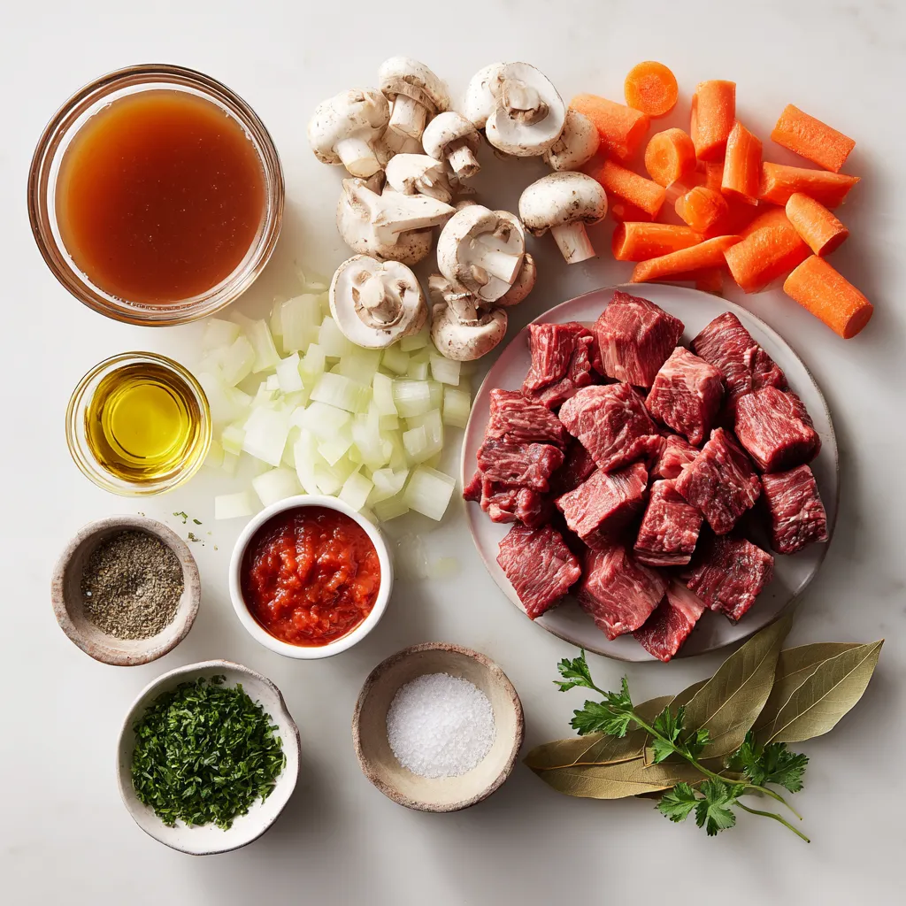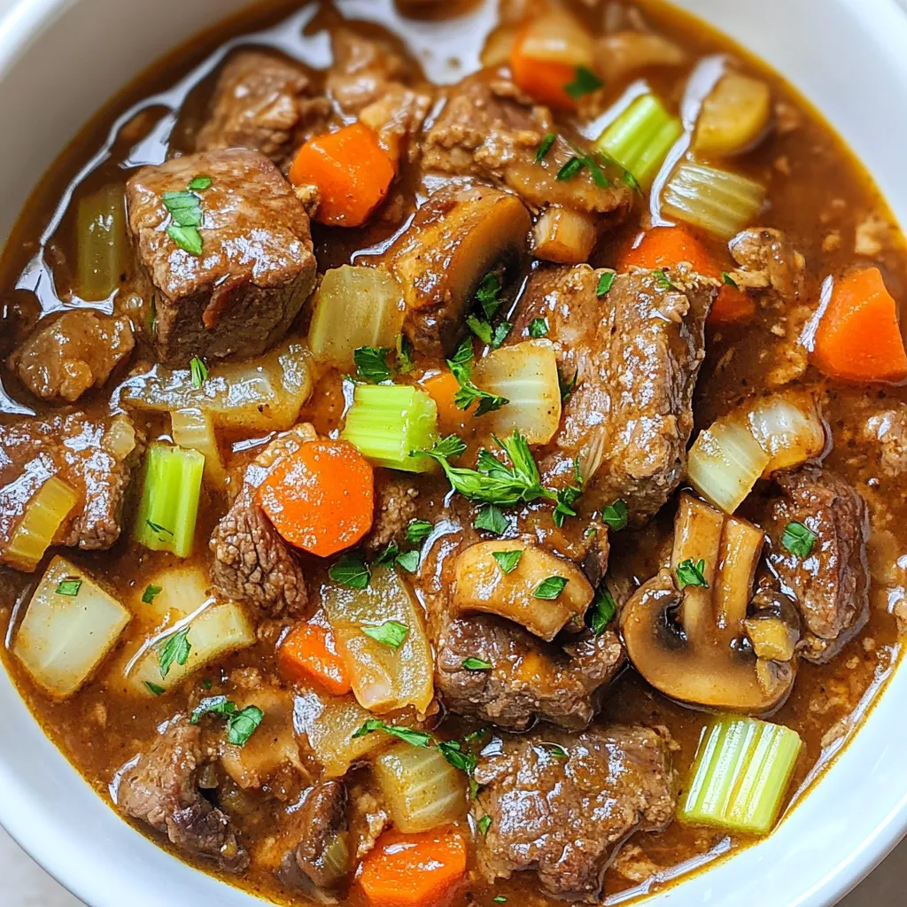 A hearty stew featuring tender beef, mushrooms, and vegetables, perfect for a comforting meal.