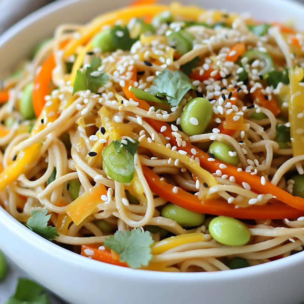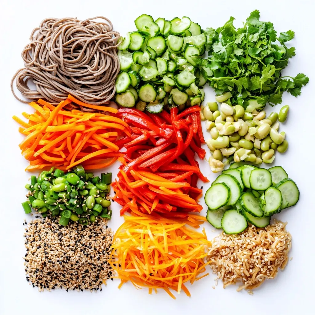 These ingredients bring color and crunch to the dish. The soba noodles are the base, while the veggies add nutrition. Edamame gives protein, and sesame seeds add a nutty flavor.