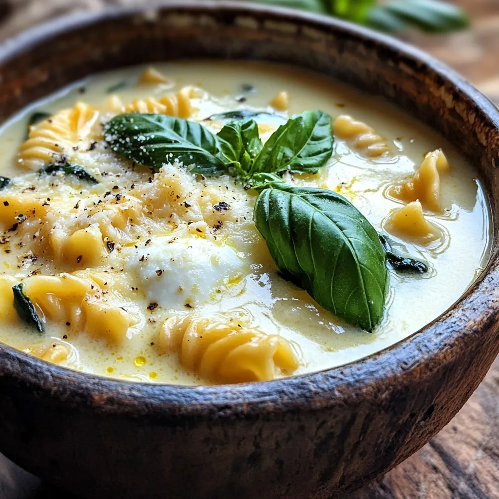 For creaminess, use one container of ricotta cheese. Add two cups of fresh spinach for color and nutrition. You can’t forget cheese! Use one cup of shredded mozzarella and half a cup of grated Parmesan. Finally, season with salt and pepper to taste, and garnish with fresh basil. This gives your soup a pop of flavor and color.